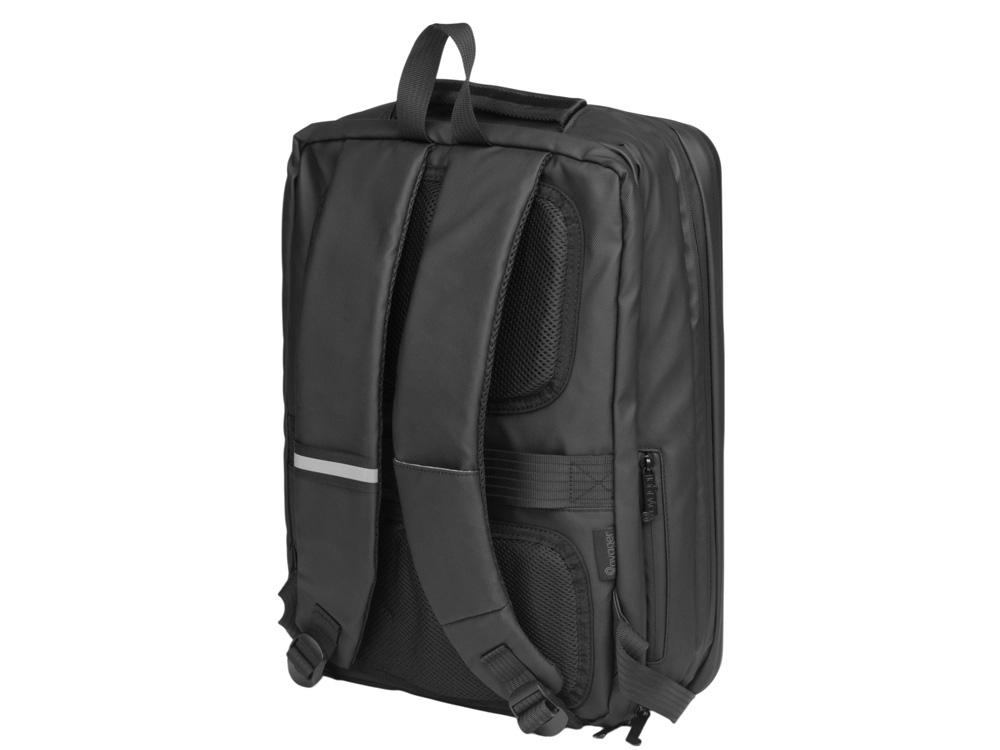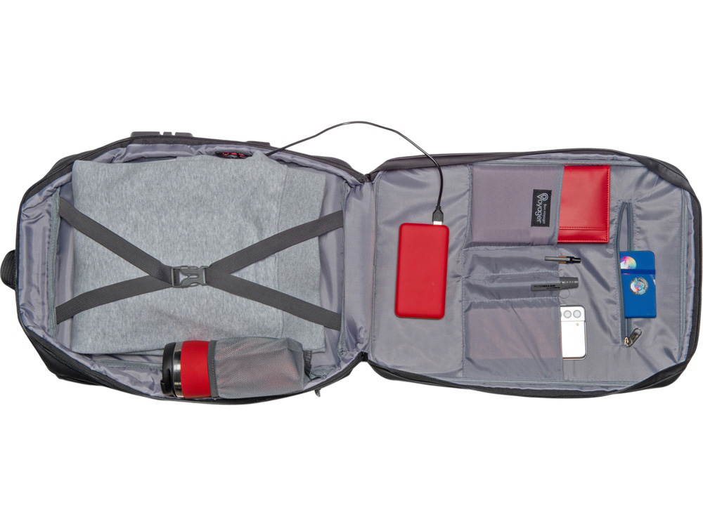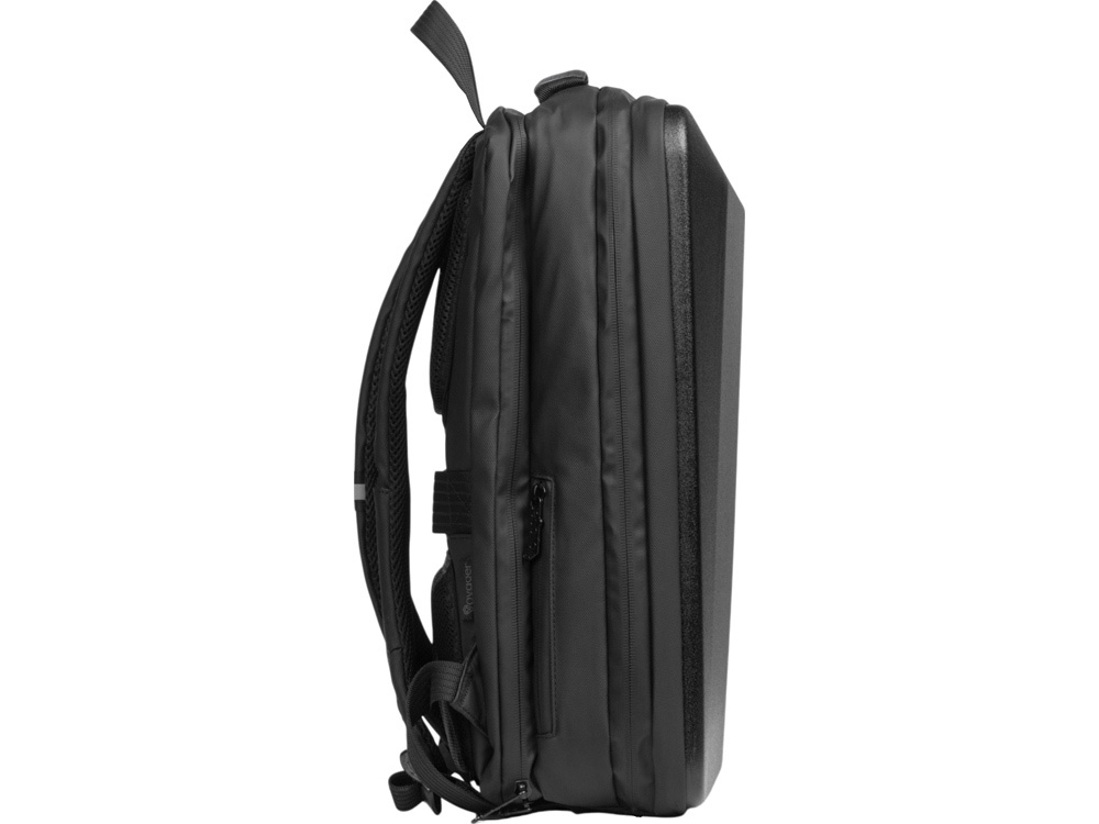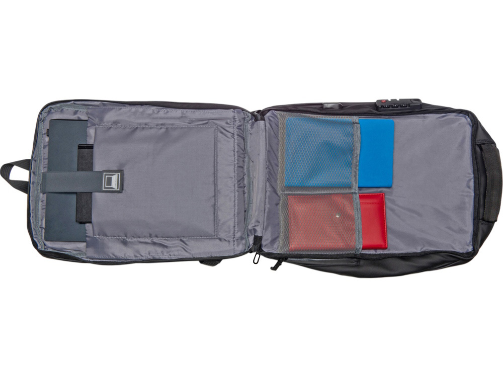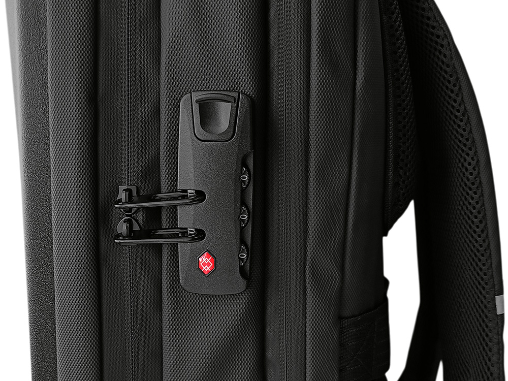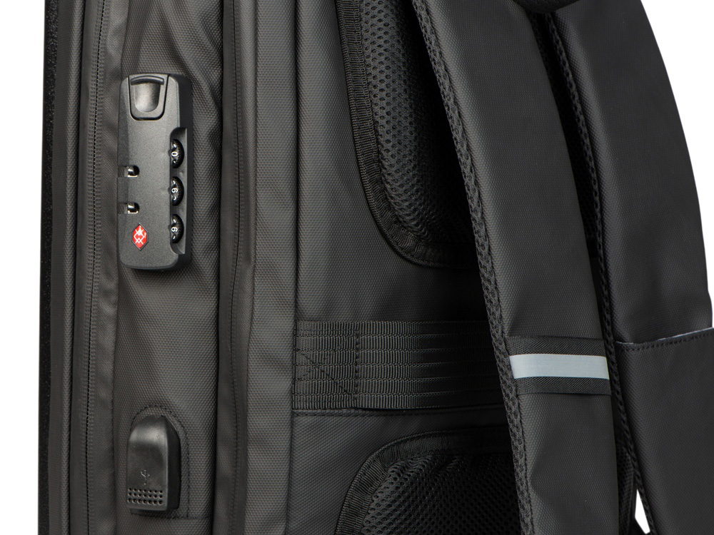 Водостойкий бизнес-рюкзак с пластиковой панелью спереди выглядит стильно и обеспечивает бережное хранение ваших личных вещей. Подходит для передвижений по городу и деловых поездок. 2 вместительных отделения позволяют разместить все необходимое: большое отделение для одежды с фиксирующими ремнями и органайзером, меньшее отделение с карманами для ноутбука и планшета и сетчатым органайзером. Несанкционированный доступ к содержимому вашего рюкзака будет затруднён благодаря кодовому замку и прочной пластиковой панели спереди. В рюкзаке предусмотрено много дополнительных удобств для использования: - интегрированный карман на молнии для бутылки сбоку - расстегнули, не снимая рюкзак, и бутылка окажется внутри корпуса - USB выход - светоотражающий элемент на лямке для большей безопасности - карман на лямке для карт, проездного или ключей - регулирующиеся по длине лямки - сетчатая спинка - ремень для крепления на ручку чемодана - нетканый мешок для хранения в комплекте - шильд для нанесения вашего логотипа в комплекте