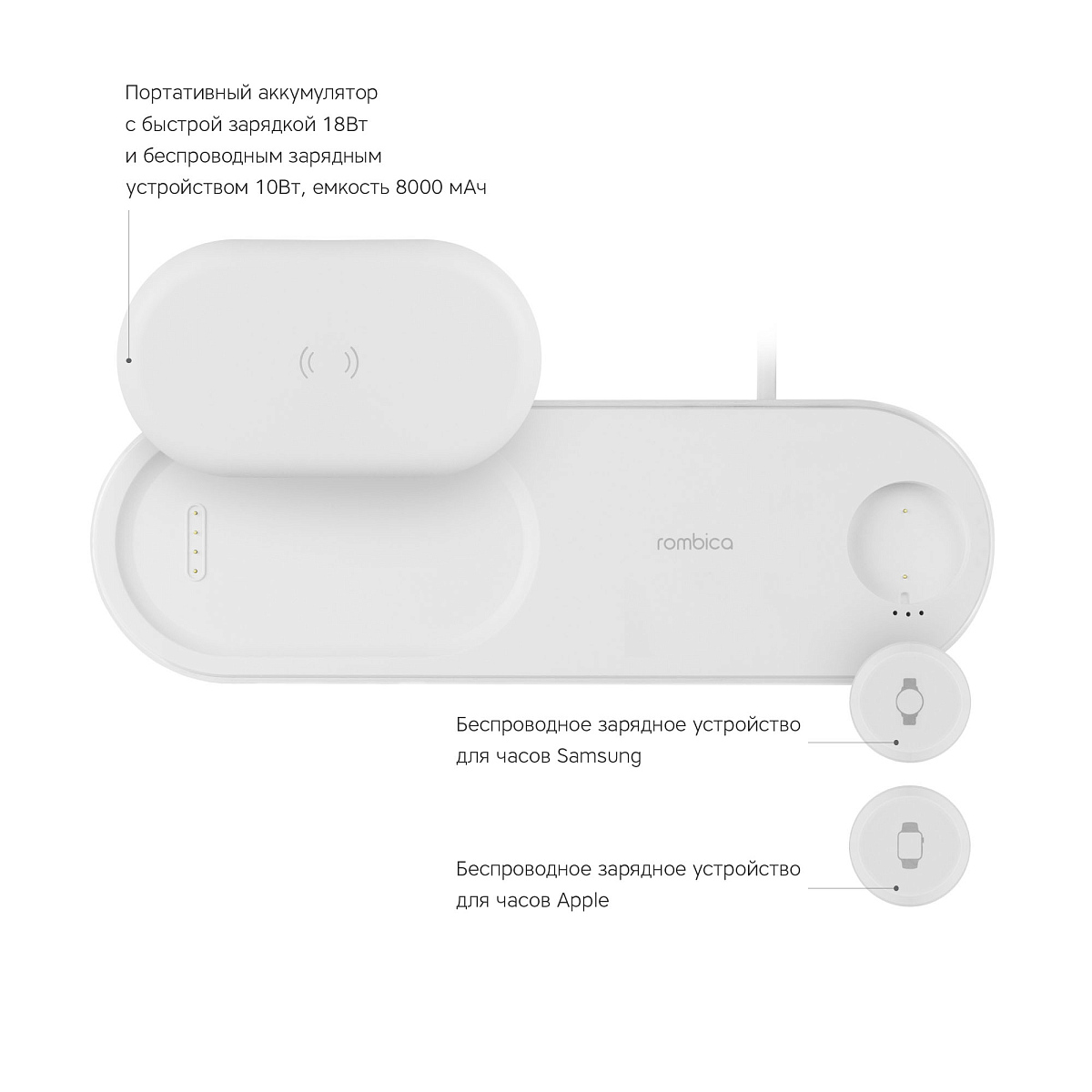 Особенности: быстрая беспроводная зарядка поддерживает режимы 5/7.5/10 Вт; поддерживает различные устройства изготовленные по стандарту Qi; внешний аккумулятор 8000 мАч с быстрой зарядкой 18 Вт по стандарту Power Delivery и беспроводной зарядкой 10Вт; два сменных беспроводных модуля для зарядки часов от Apple и Samsung