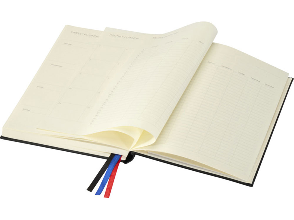Блокнот Alder формата A5 изготовлен из переработанного пластика, имитирующего кожу, и имеет 192 листа из кремовой бумаги плотностью 80 г/м², оформленные в виде планировщика, идеально подходящего для ведения дневника и поддержания порядка в течение всего года. Имеет две эластичные резинки, три ленточные закладки (черная, красная и синяя), 200 разноцветных липких заметок (по 40 каждого цвета) и удобный бумажный кармашек для отдельных заметок. На задней обложке тиснением нанесен логотип JournalBooks, упакован в картонный слив-бокс белого цвета.