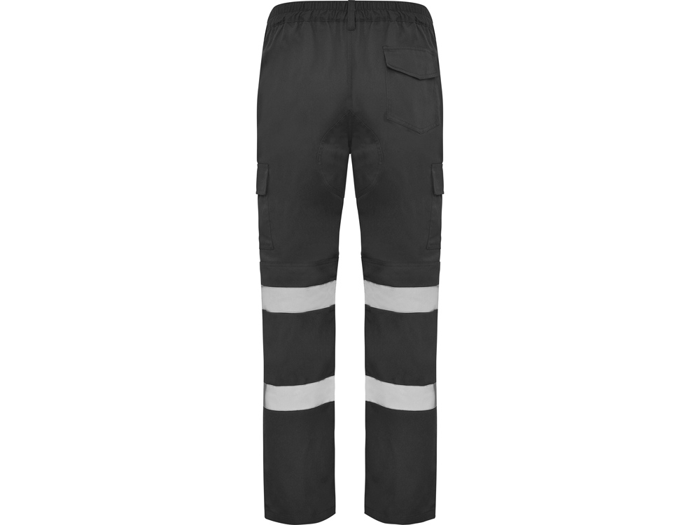 Брюки из прочной ткани. 1. Регулируемый эластичный пояс сзади. 2. Два кармана спереди. 3. Функциональный карман сзади с клапаном на липучке. 4. Два боковых карманы с клапаном на липучке. 5. Дополнительное усиление сзади для защиты от протирания при сидении. 6. Двойная ткань на коленях. 7. Две горизонтальные светоотражающие полосы.