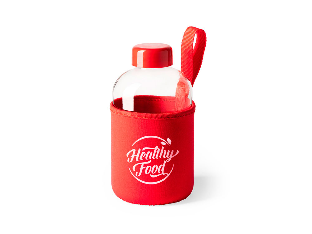 Стеклянная бутылка емкостью 600 мл. включает инновационный неопреновый чехол самых разных цветов с ручкой для переноски.