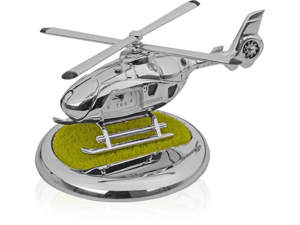 Оригинальные часы в форме вертолета на посадочной площадке. Площадка стилизована под зеленый газон. Корпус вертолета и подставка выполнены из полированного металла. Возможно нанесение оригинальной гравировки: текста поздравления, имени владельца или логотипа компании.