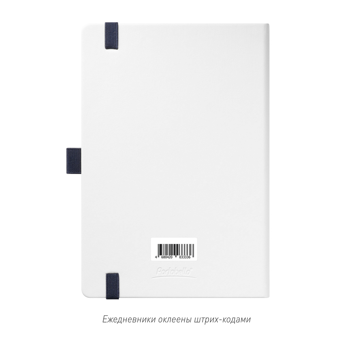 Недатированный ежедневник выполнен в жесткой обложке из искусственной кожи со скругленными уголками. Переплетный материал гладкий, с легкой естественной паутинкой морщин, имеет полуглянцевый блеск. Цвет – чистый белый. Черные матовые форзац и нахзац, а также черный срез блока создают оригинальный динамичный цветовой ансамбль и подчеркивают белизну обложки. Страницы светло-кремового цвета, из гладкого офсета, слегка шелковистые, со скругленными уголками. Добавляют изделию мягкую комфортную теплоту. Двойное атласное ляссе составлено из черной и белой лент. Каждая шириной 6 мм, имеет легкий блеск. Вертикальная фиксирующая резинка прочная, надежная и удобная, в тон срезу. Есть петелька для ручки в тон резинки. Карман на заднем форзаце.