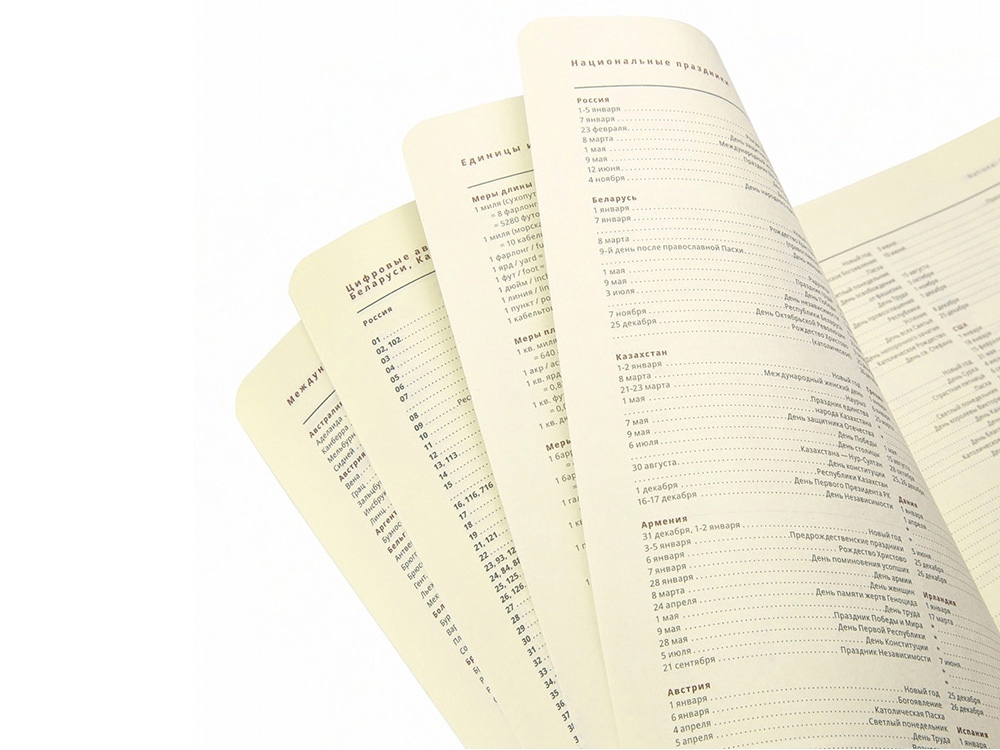Недатированный ежедневник Prestige от бренда Bruno Visconti - это качественный корпоративный подарок по выгодной цене, произведенный специально под персонализацию. Представлен в универсальном формате А5 и содержит 320 страниц. Не лишенный солидности и респектабельности новый ежедневник Prestige от Bruno Visconti идеально дополняет имидж современных профессионалов. Твердая обложка выполнена из гладкого кожзама, неотличимого от кожи fiore vegetale. Скругленный корешок и уголки обложки в сочетании с магнитным клапаном делают ежедневник Prestige невероятно стильным аксессуаром. Глянцевая поверхность материала акцентирована контрастной белой строчкой вдоль закругленного края. Функциональная деталь - широкий магнитный клапан. Декоративный хлястик надежно фиксирует блок, исключая случайное раскрывание в сумке. В ежедневнике Prestige есть полезная справочная информация на русском языке, а также страницы для записи идей, мыслей и составления рабочих планов. Дни недели указаны сокращенно на английском языке. Для изготовления страниц используется качественный бежевый офсет повышенной плотности (70 г/кв м), который производится в Японии и подходит для всех видов чернил. Разметка блока с указанием времени позволяет планировать дела с точностью до 1 часа. Ежедневники от бренда Bruno Visconti можно персонализировать с помощью всех видов тиснения обложки. Наши ежедневники помогут быть успешным и эффективным в карьере и повседневной жизни!