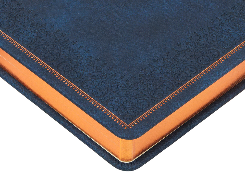 Недатированный ежедневник Royal формата А4 с твердой обложкой из искусственной кожи с имитацией нубука украшен художественным бронзовым и блинтовым тиснением. Внутри 192 страницы, выполненные из качественной бежевой бумаги в линейку плотностью 140 г/м². Два шелковых ляссе в цвет обреза блока и обложки облегчают навигацию по записям. Французский корешок дополнительно декорирован изящным бронзовым тиснением в виде виньеток. Скругленные углы обложки и блока подчеркивают стильный дизайн изделия, а блеск бронзового обреза дарит ежедневнику благородный и роскошный внешний вид.