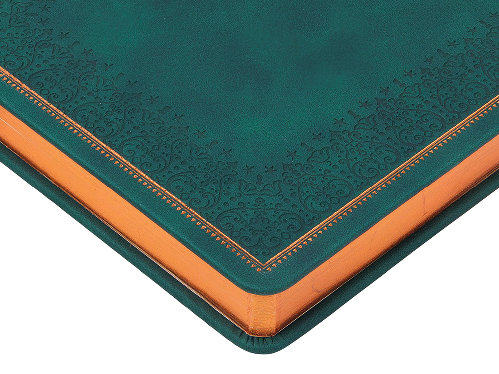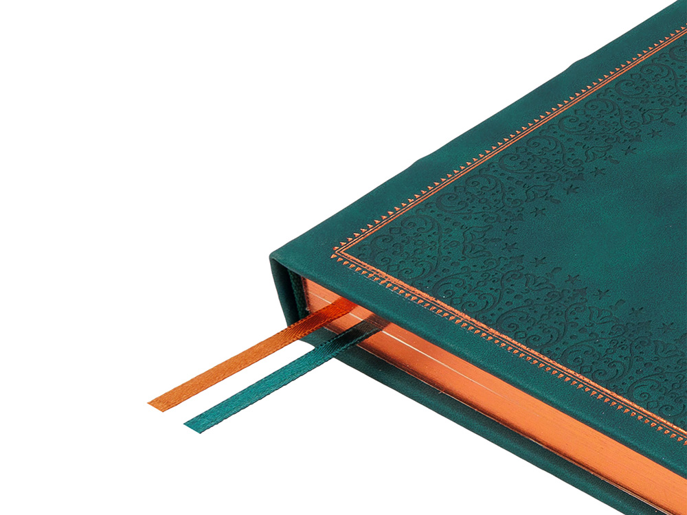 Недатированный ежедневник Royal формата А4 с твердой обложкой из искусственной кожи с имитацией нубука украшен художественным бронзовым и блинтовым тиснением. Внутри 192 страницы, выполненные из качественной бежевой бумаги в линейку плотностью 140 г/м². Два шелковых ляссе в цвет обреза блока и обложки облегчают навигацию по записям. Французский корешок дополнительно декорирован изящным бронзовым тиснением в виде виньеток. Скругленные углы обложки и блока подчеркивают стильный дизайн изделия, а блеск бронзового обреза дарит ежедневнику благородный и роскошный внешний вид.