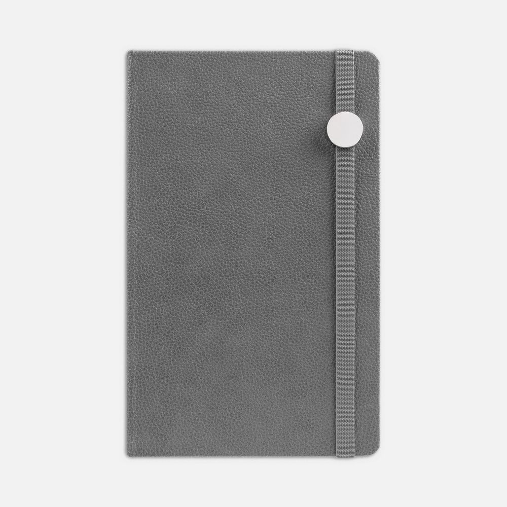 Зауженный ежедневник с круглым металлическим шильдом на резинке.