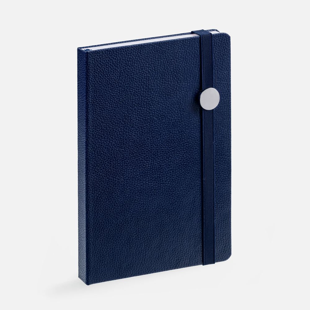 Зауженный ежедневник с круглым металлическим шильдом на резинке.