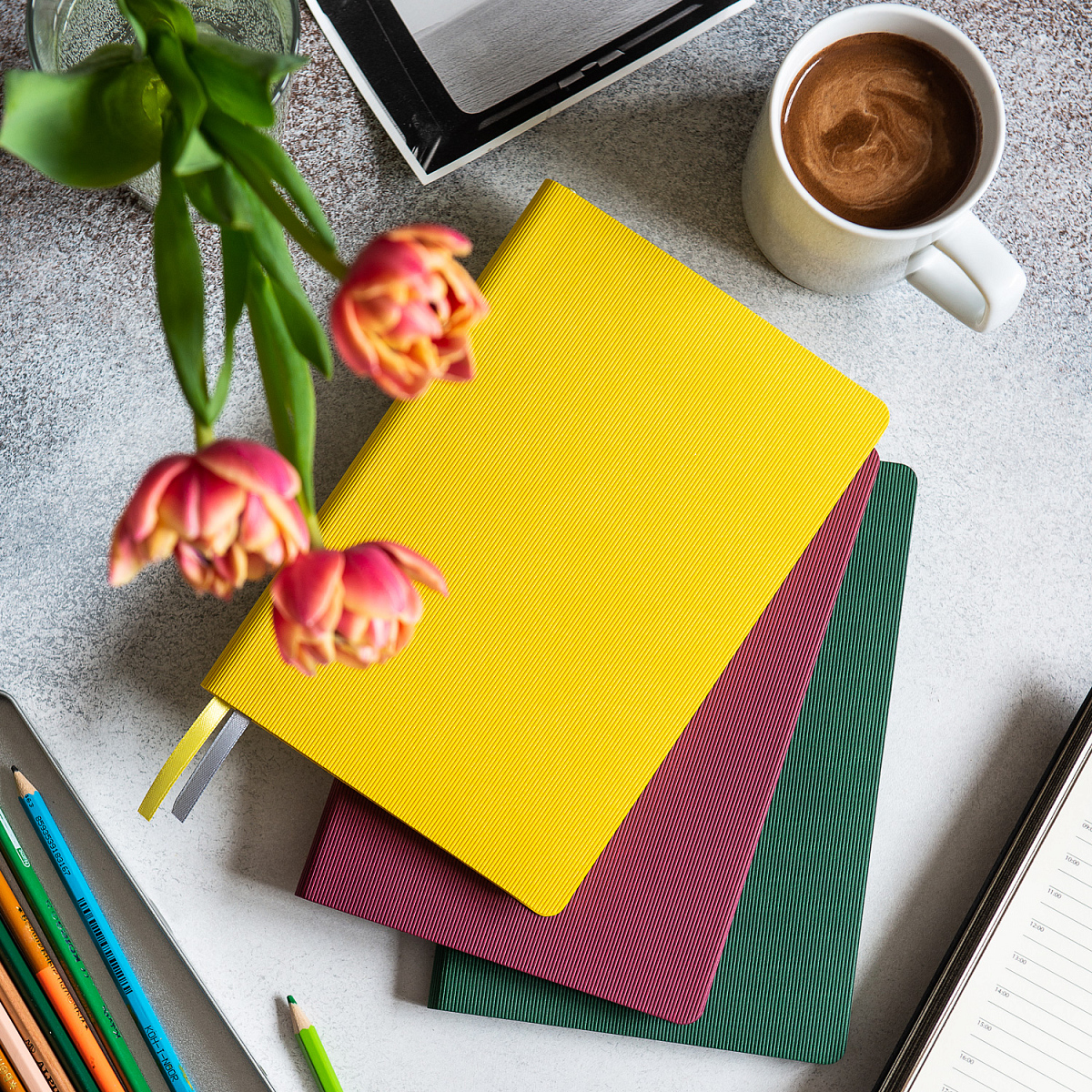 Глубокий, насыщенный цвет обложки гармонично сочетается с матовыми серыми форзацем и нахзацем. Скругленные уголки страниц и матовый срез блока, идеально подобранный в тон обложке, добавляют изысканности.