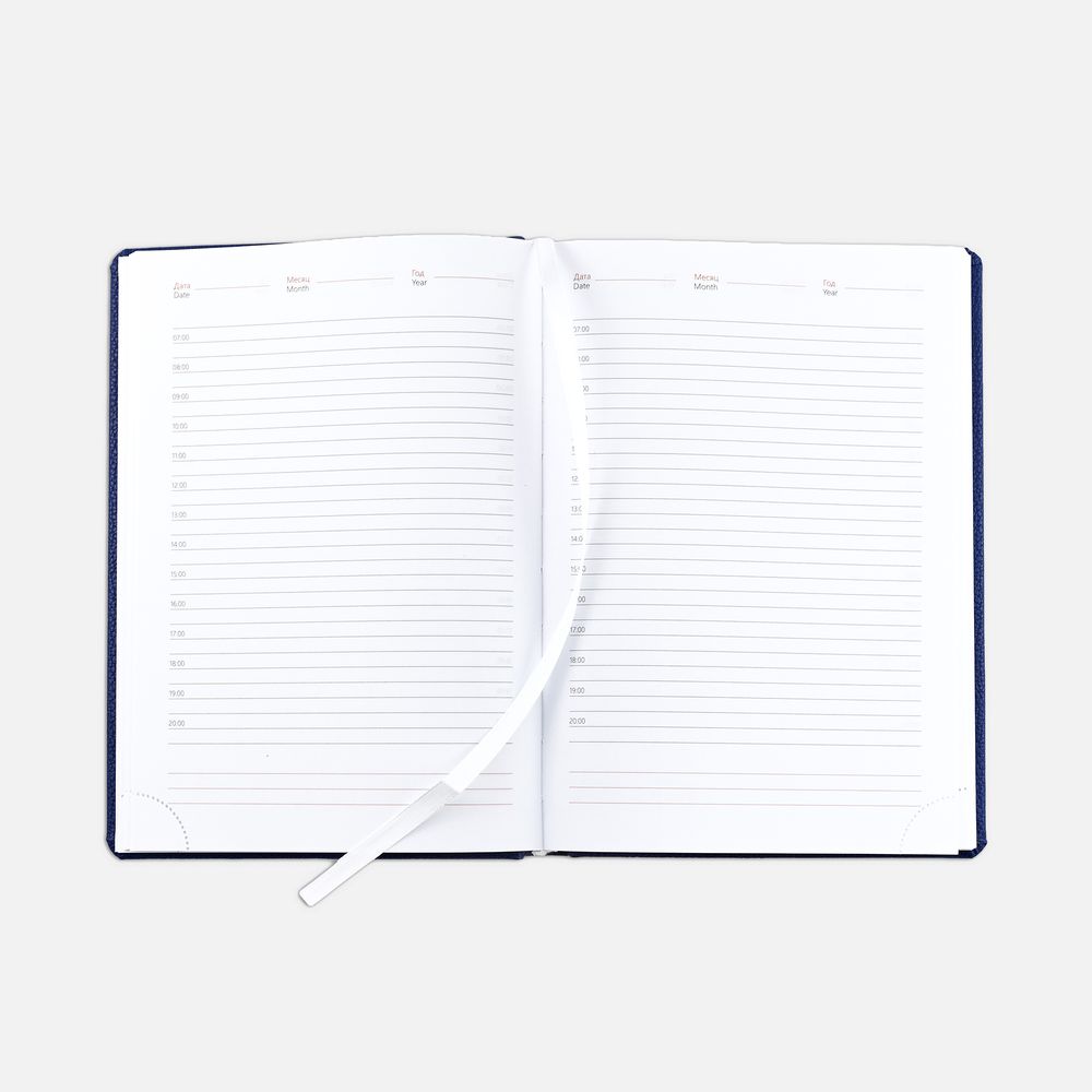 Ежедневник в твердой обложке c поролоном, выполнен из материала La Fite, темно-синий ХХ, дополнен ляссе белого цвета.