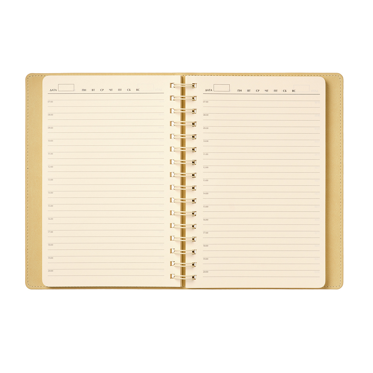 Внутренний блок с кремовыми страницами и срезом гармонично сочетается с нежным оттенком форзаца и нахзаца, повторяющим цвет внутреннего материала обложки. Надежная полускрытая пружина обеспечивает удобство использования и долговечность.