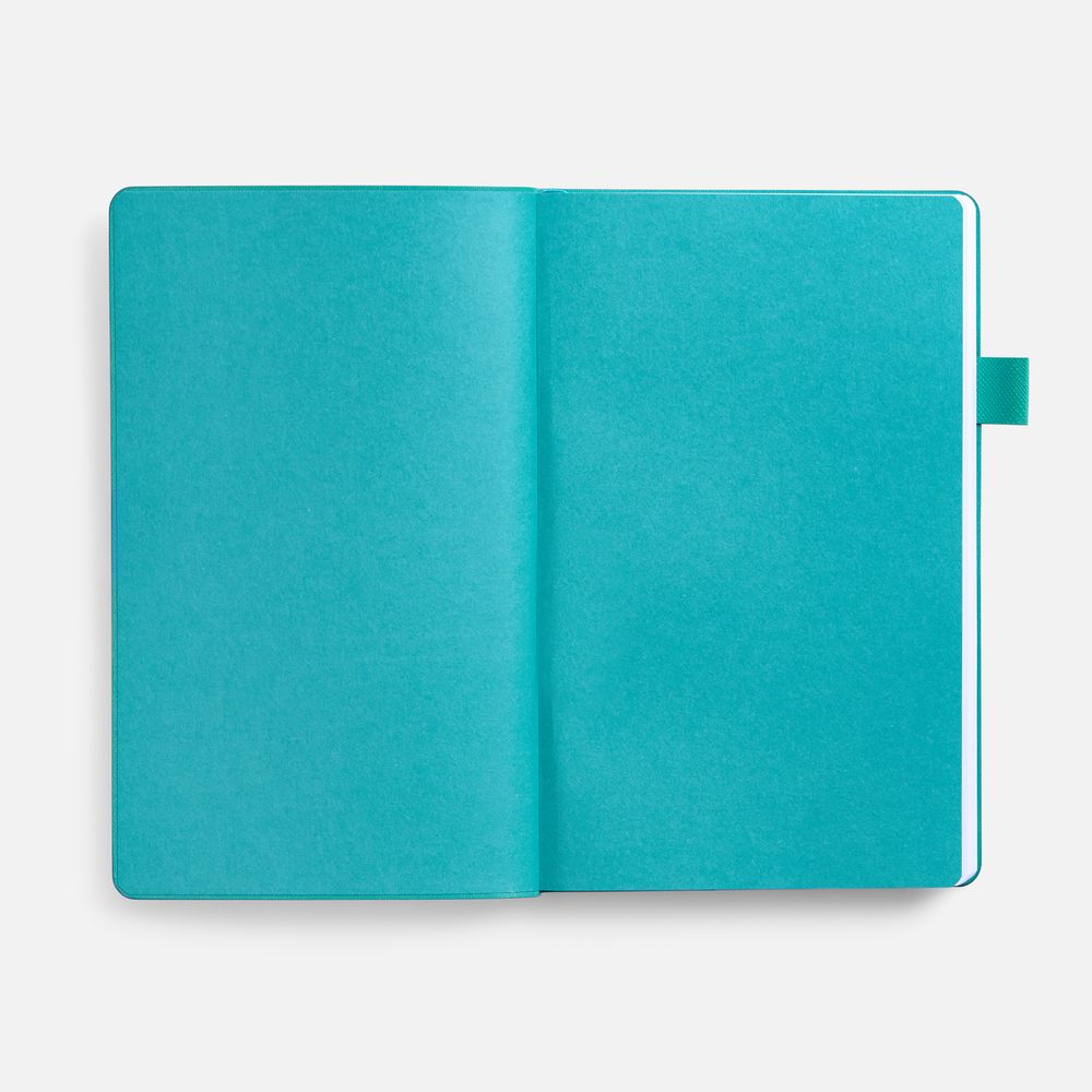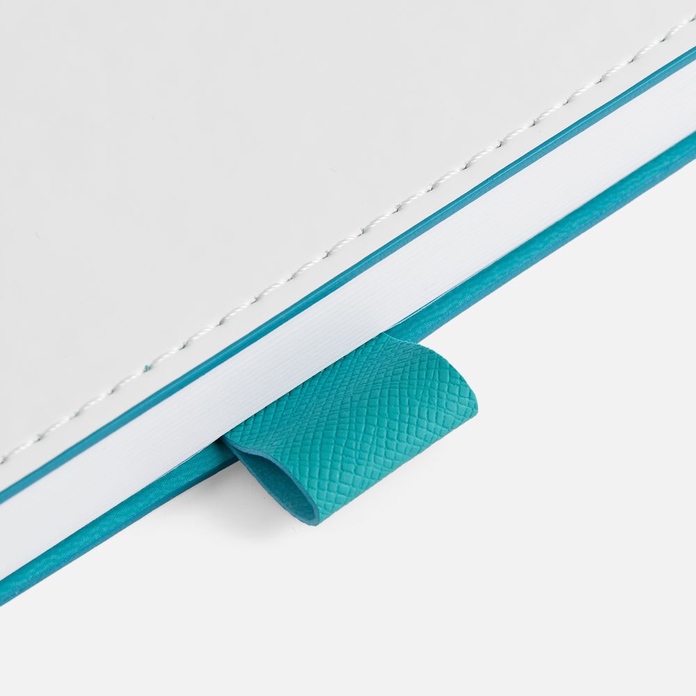 Гибкая обложка, материал обложки — Soft Touch, белый BB и Latte, цвета морской волны II, материал петли для ручки — Nice Touch, цвета морской волны II. Срез обложки окрашен в цвет морской волны.