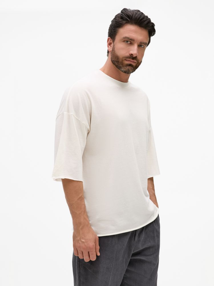 Футболка унисекс свободного кроя со спущенным плечом.