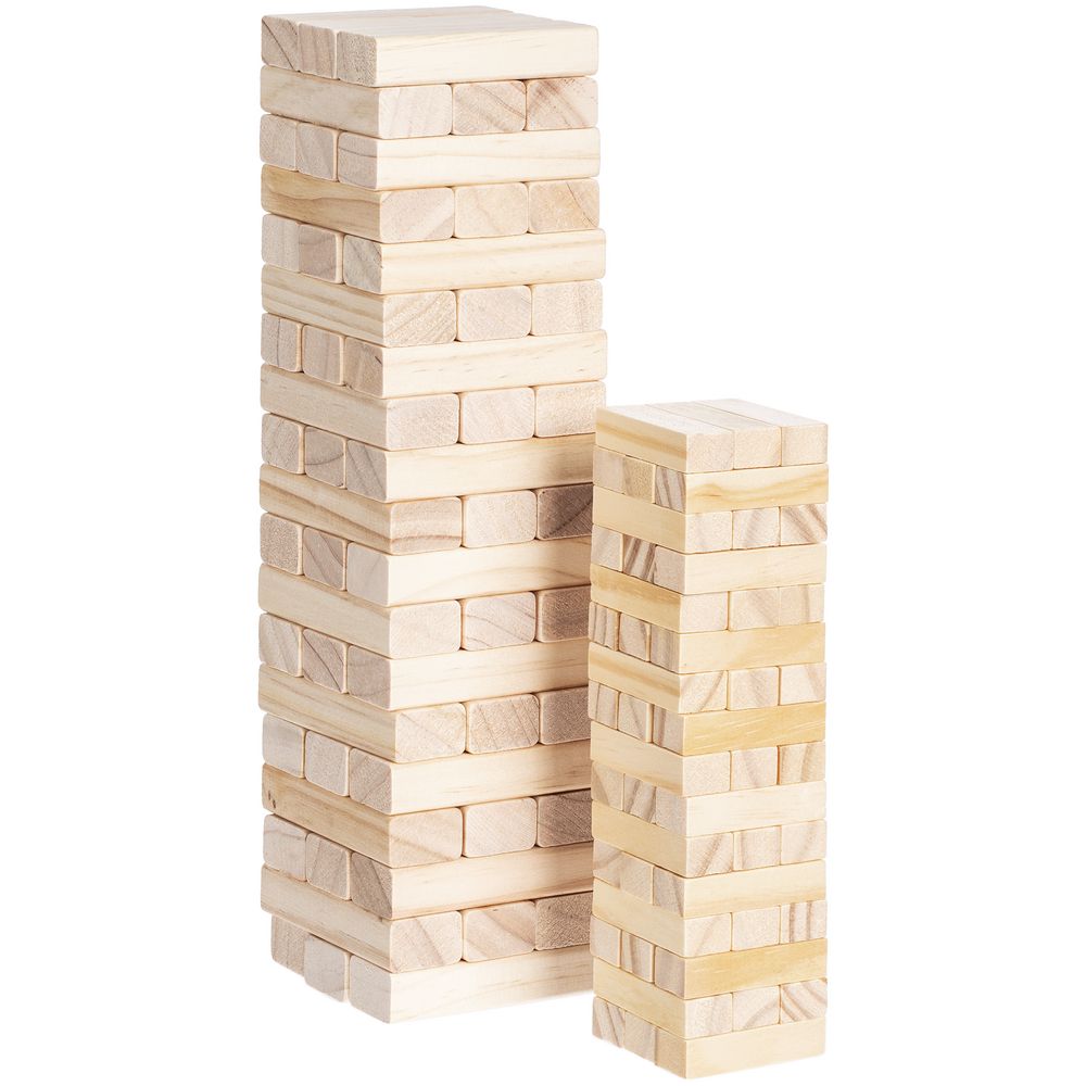 Игра состоит из 57 деревянных брусочков. Поставляется в черной картонной коробке с контурным изображением башни. Инструкция с правилами в комплекте.