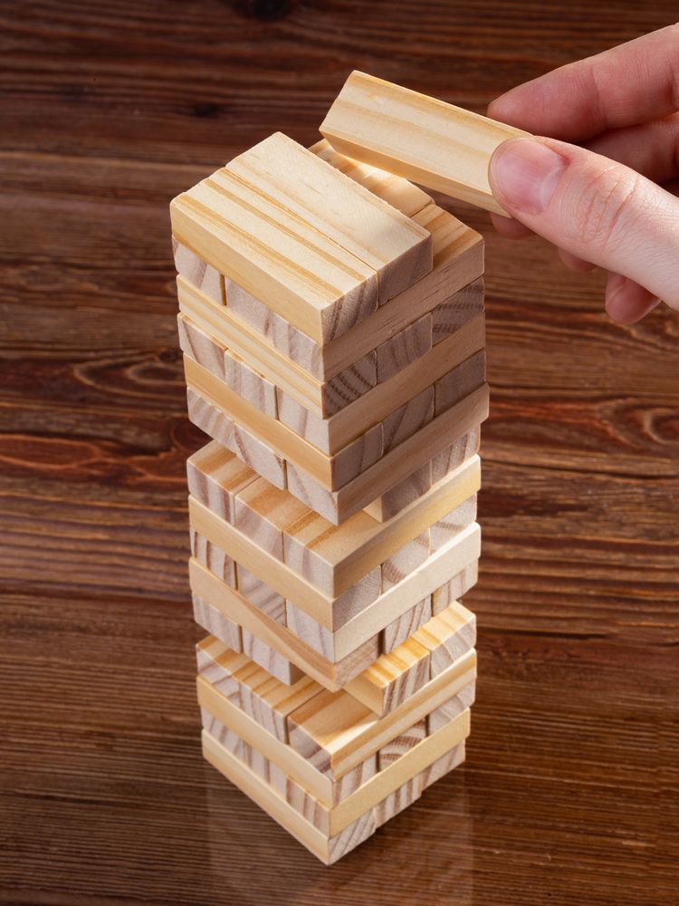 Второе название игры — «Падающая башня». Сначала строится башня: по три брусочка в ряд, каждый слой перпендикулярен предыдущему. Затем игроки по очереди вытаскивают по одному брусочку и кладут его на верх сооружения. Тот игрок, кто обрушит башню, проиграл. Игра тренирует ловкость, внимание, терпение и пространственное мышление, что очень важно и в бизнесе. Так что подарок не только развлечет, но и может стать символом-пожеланием.
