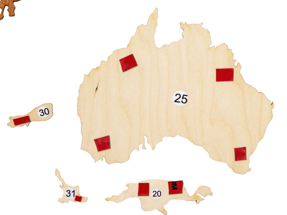 Комплектность: элементы карты (материки,острова), декоративные элементы (самолетики,кораблики), инструкция, упаковочная коробка, деревянный шильд для персонализации