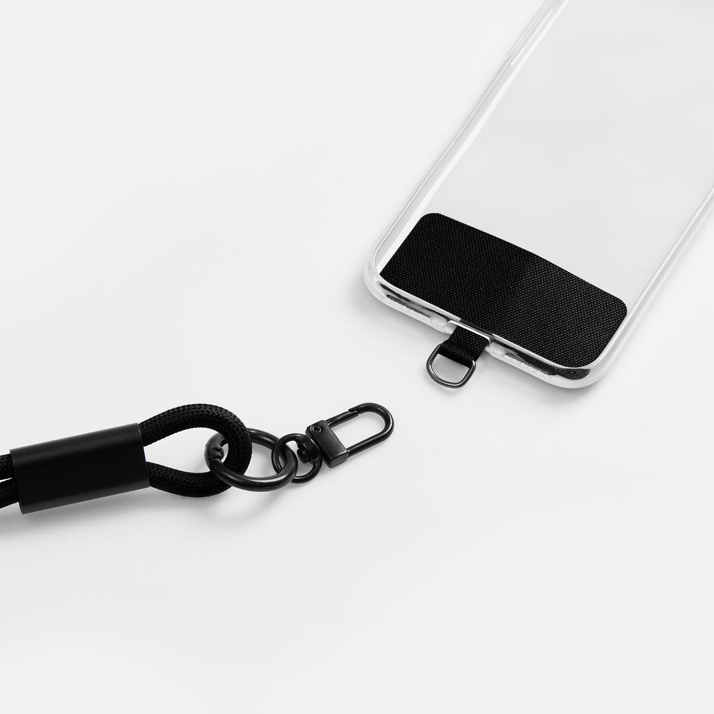 Важно: Для крепления телефона на ланьярд телефон должен иметь чехол. Если ланьярд распускается под тяжестью смартфона, убедитесь, что среднее из трех колец фурнитуры находится по центру ланьярда (на шее под затылком), а не сбоку. Соседние ветви оплетки должны идти вместе, без зазоров, так достигается трение ткани о ткань. Слишком тяжелые смартфоны (диагональ 6,9" и более) могут распускать ланьярд при энергичных движениях.