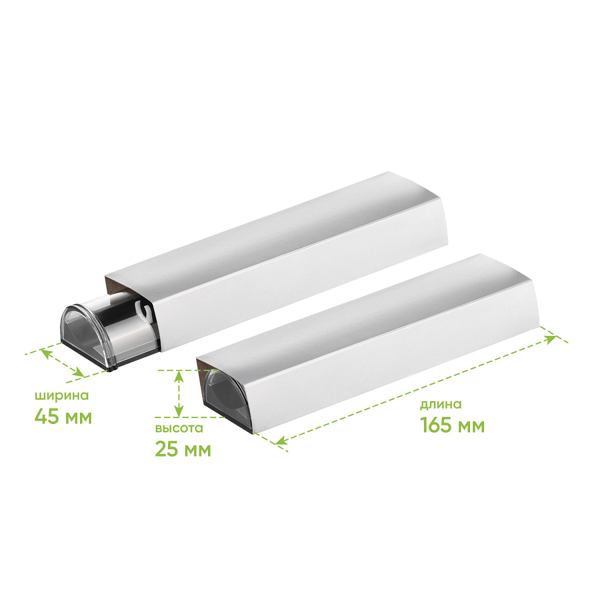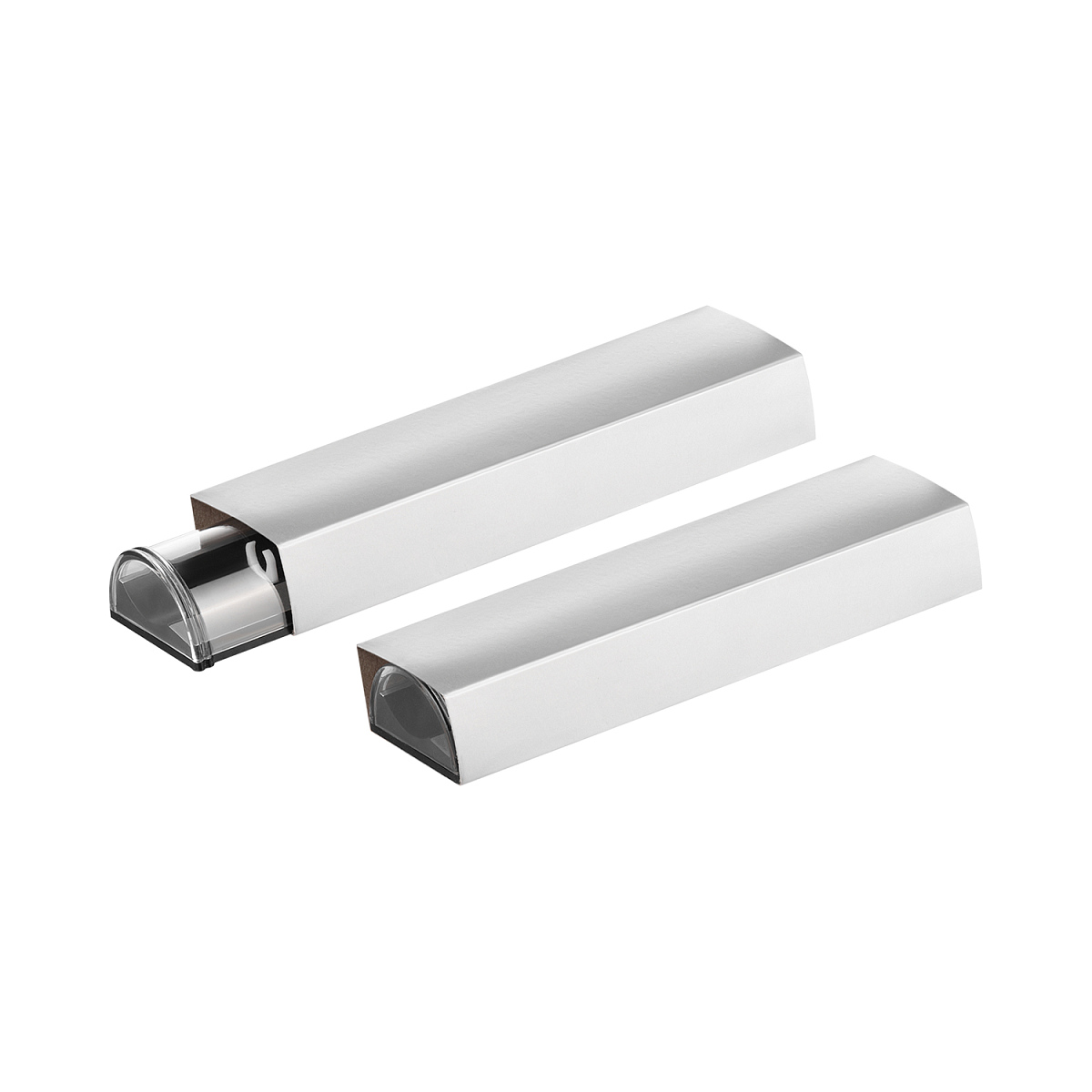 Поверхность гладкая, матовая, с приглушенным блеском. Цвет – классический черный. Отделка – серебристые матовые элементы вдоль корпуса. Два держателя для ручки белого цвета. Крышка прозрачная пластиковая. Футляр надежно закрывается и идеально подходит как для подарочного оформления изделия, так и для повседневного хранения бизнес-аксессуара.
