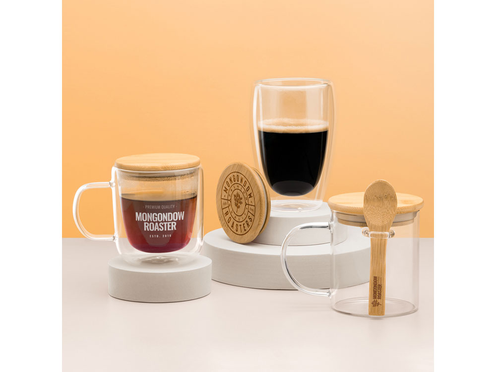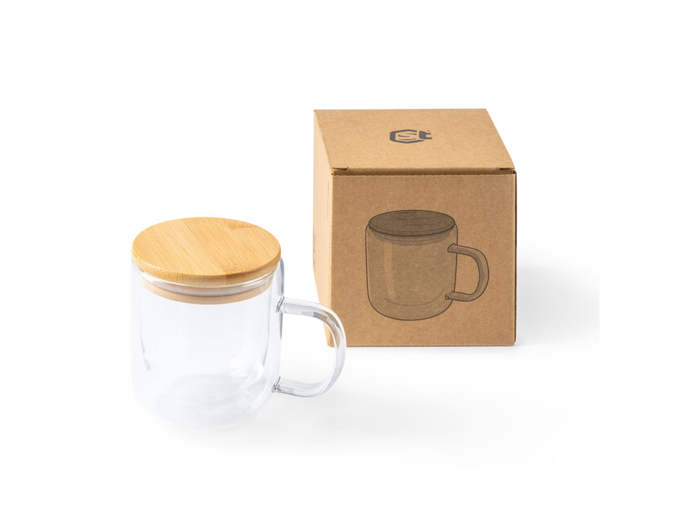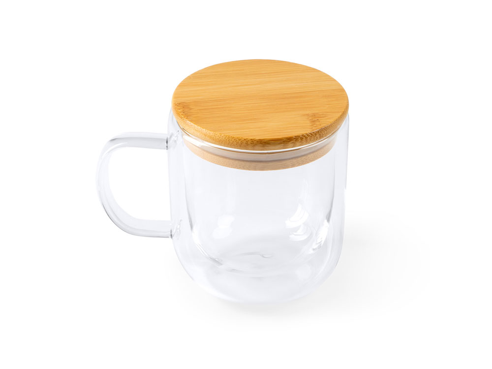 Кружка с двойными стенками из боросиликатного стекла с бамбуковой крышкой. Объем 280 мл.