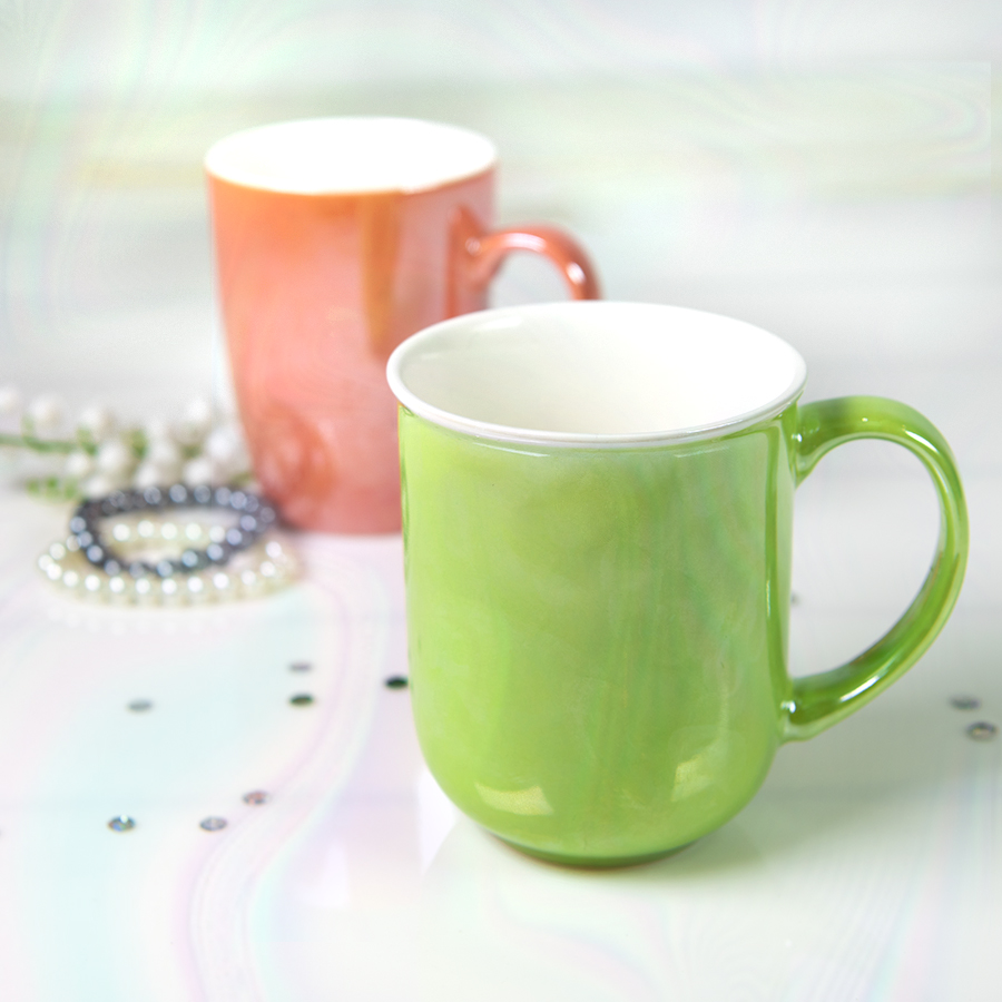 Кружка необычной, скругленной внизу формы, дополнена белым кантом по верхнему краю и актуальным покрытием с жемчужным блеском или эффектом перламутра.