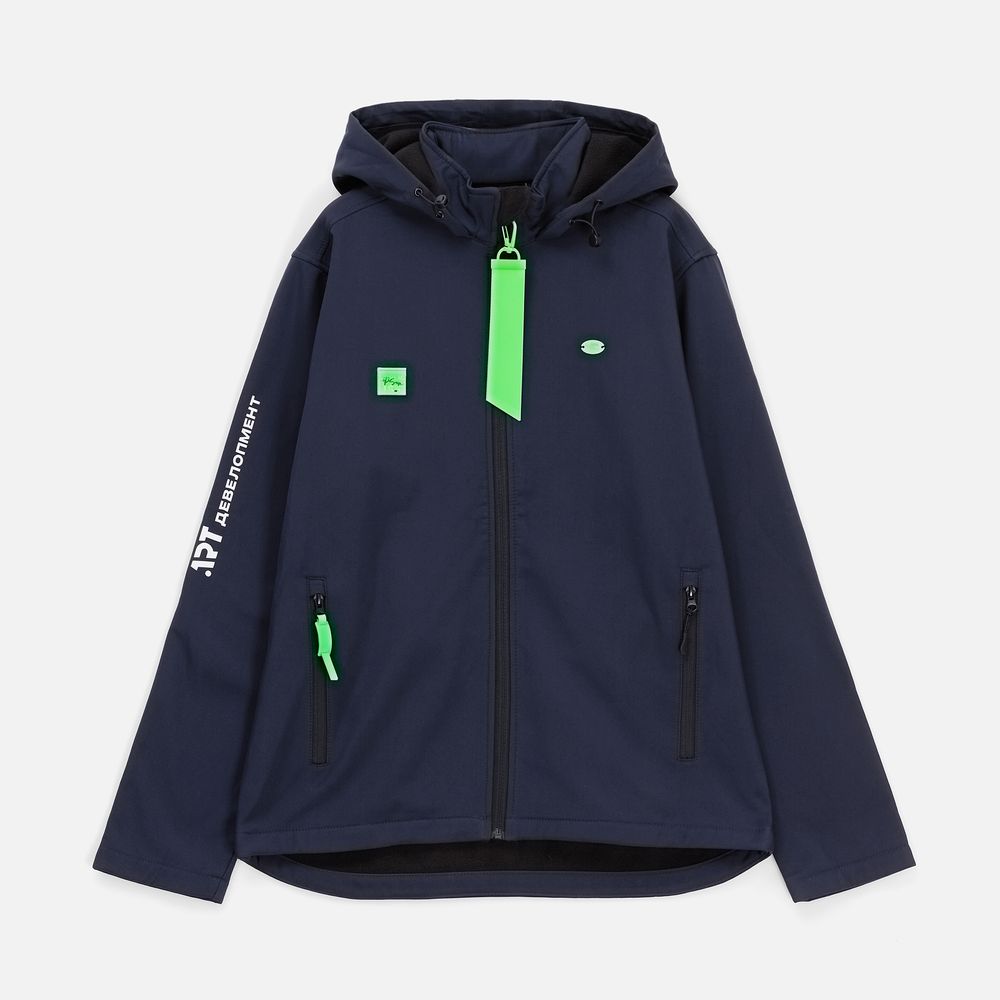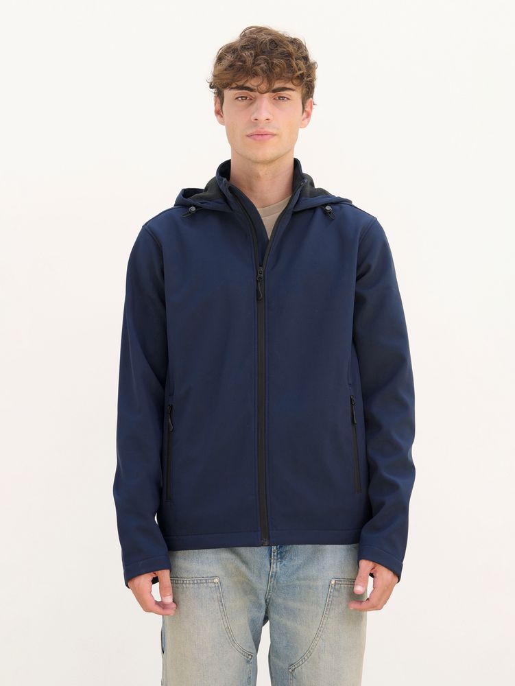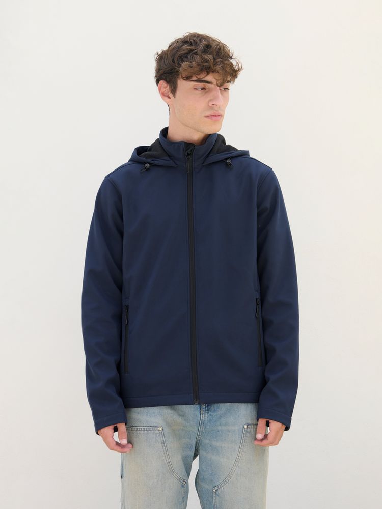 Мужская куртка софтшелл на молнии и с капюшоном.