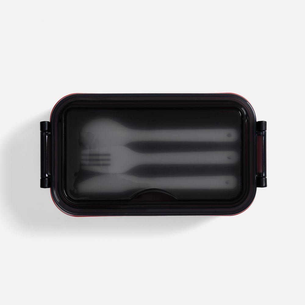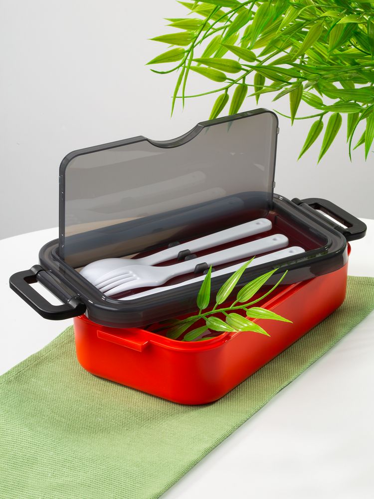 Удобная конструкция с крышкой на защелках обеспечивает надежную фиксацию. Специальное отделение под крышкой позволяет хранить столовые приборы, освобождая дополнительное пространство в сумке.