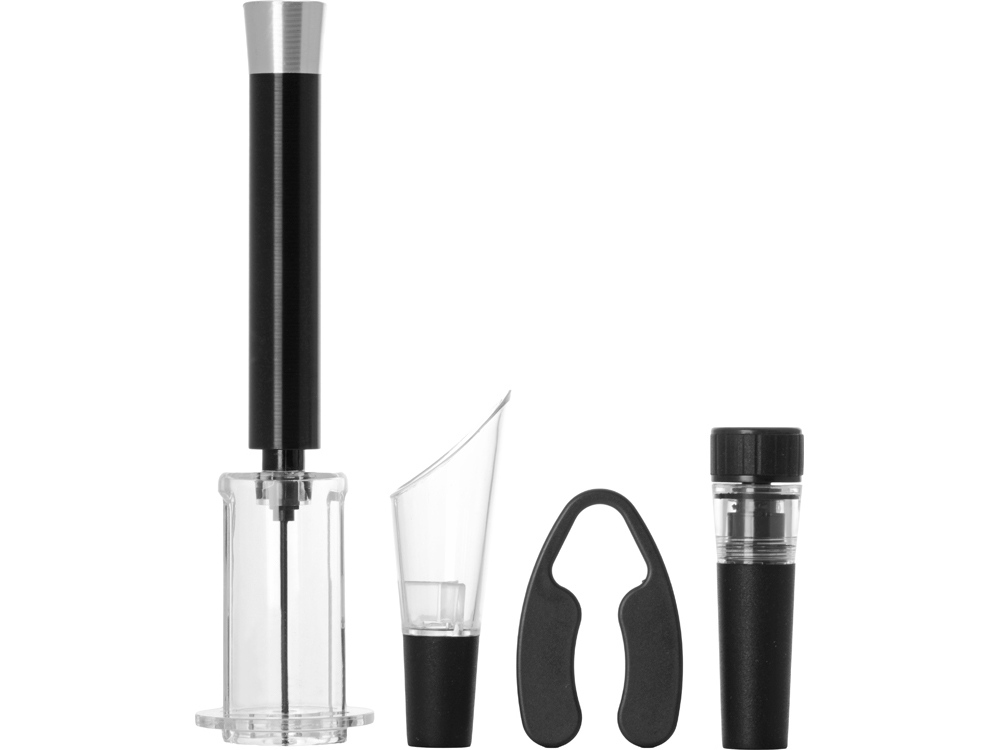 Комплектность: пневматический штопор 19 x 4,8 x 1,8 см, винная пробка 2, 5 x 1,7 x 8,5 см, аэратор 3 x 1 x 9,5 см, нож для фольги 7 x 4,5 x 0,9 см