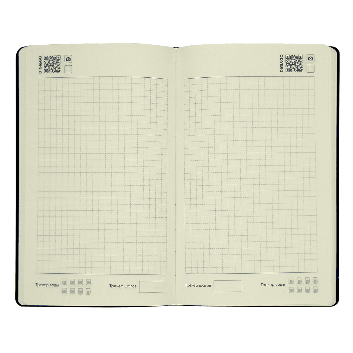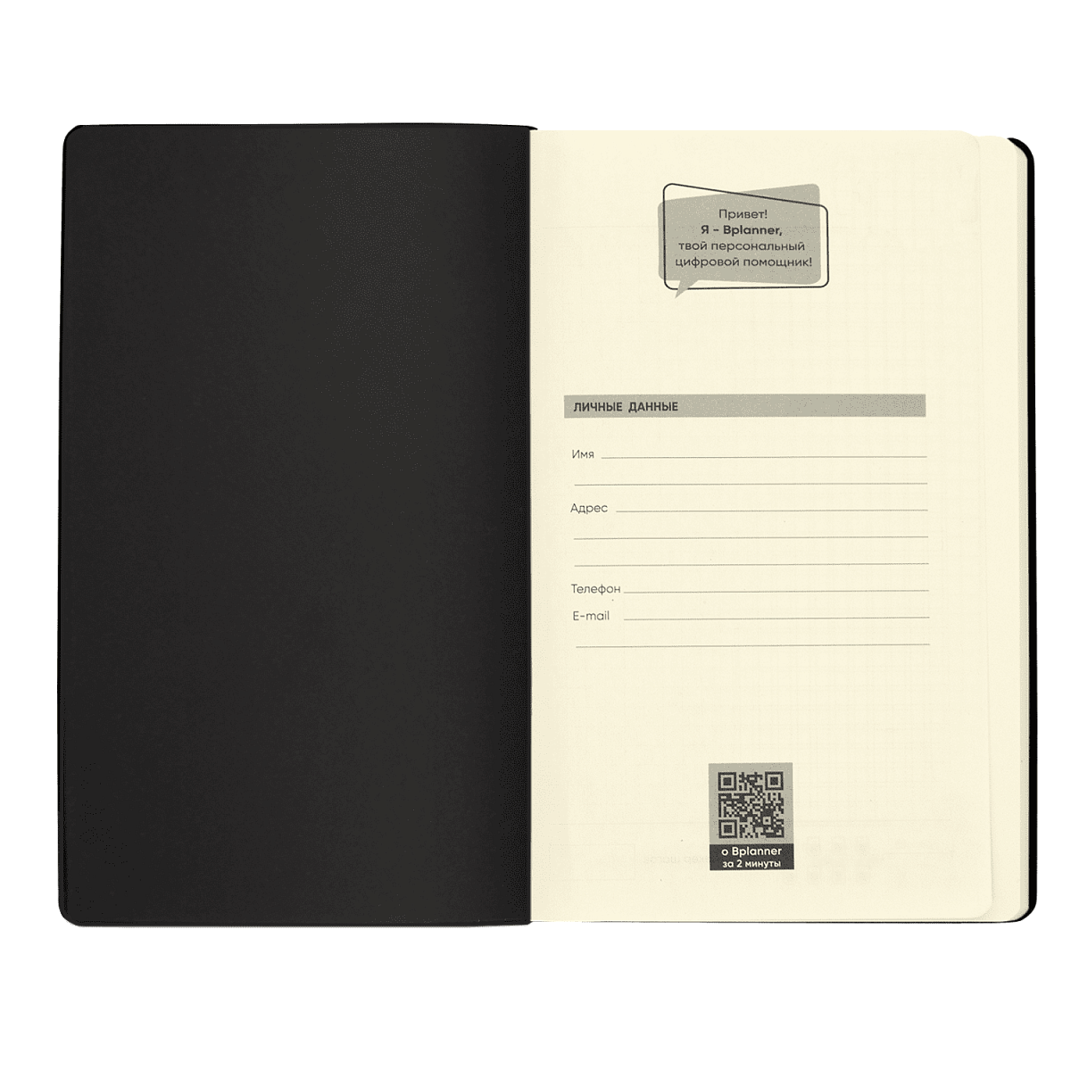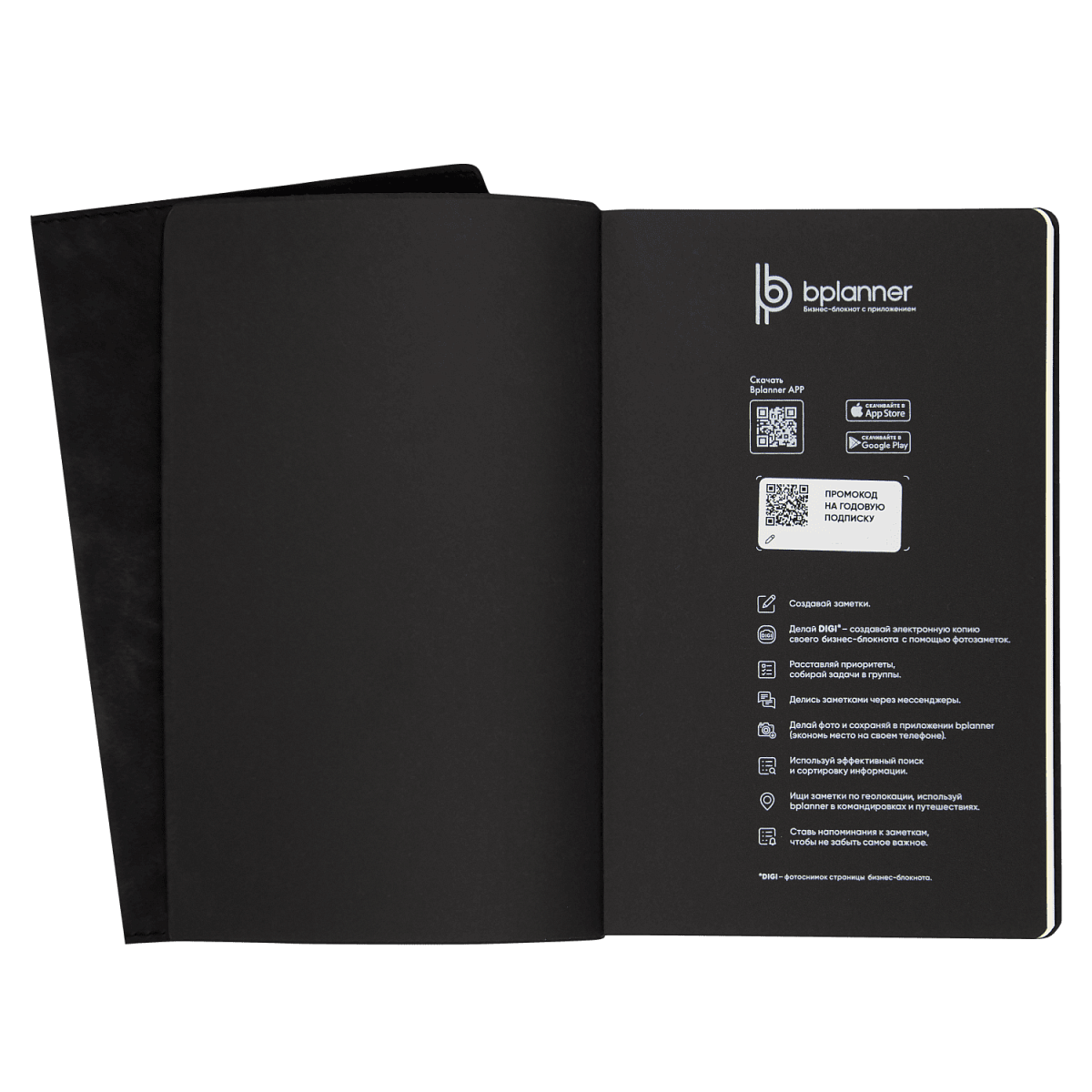 Бизнес-блокнот Bplanner. 05 — абсолютно новая модель в линейке Bplanner. Это бизнес-блокнот с недатированным тонированным блоком в клетку. Блок имеет ряд особенностей: наличие титульного листа с возможностью добавления личных данных и контактной информации, трекер воды и шагов на каждой странице и 3 разворота для заметок в конце блокнота. Обложка изготовлена из экокожи Nubuk-touch и имеет прострочку по краю в цвет материала. Фактура материала напоминает замшу или нубук. У блокнотов цветной форзац и нахзац. На форзаце расположен qr-код, который активирует годовой доступ к мобильному приложению. А приложение способно теперь еще и распознать и оцифровать текстовые заметки.