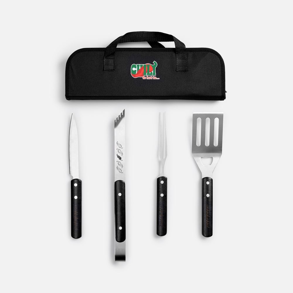 В набор входят: щипцы, вилка, лопатка и нож.