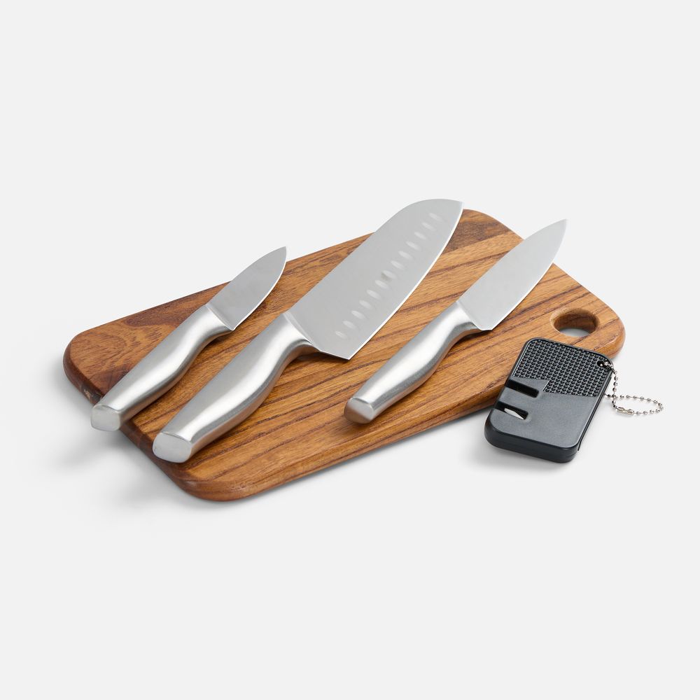 Размер: Сумка: 33,5х3х19 см; точилка: 7,8х1х5 см; нож для овощей: 19,5х1,6 см; универсальный нож: 23,5х1,6 см; нож сантоку: 29,5х1,9 см; разделочная доска: 28х15,5х1,2 см; упаковка: 19,5х34,5х4,5 см