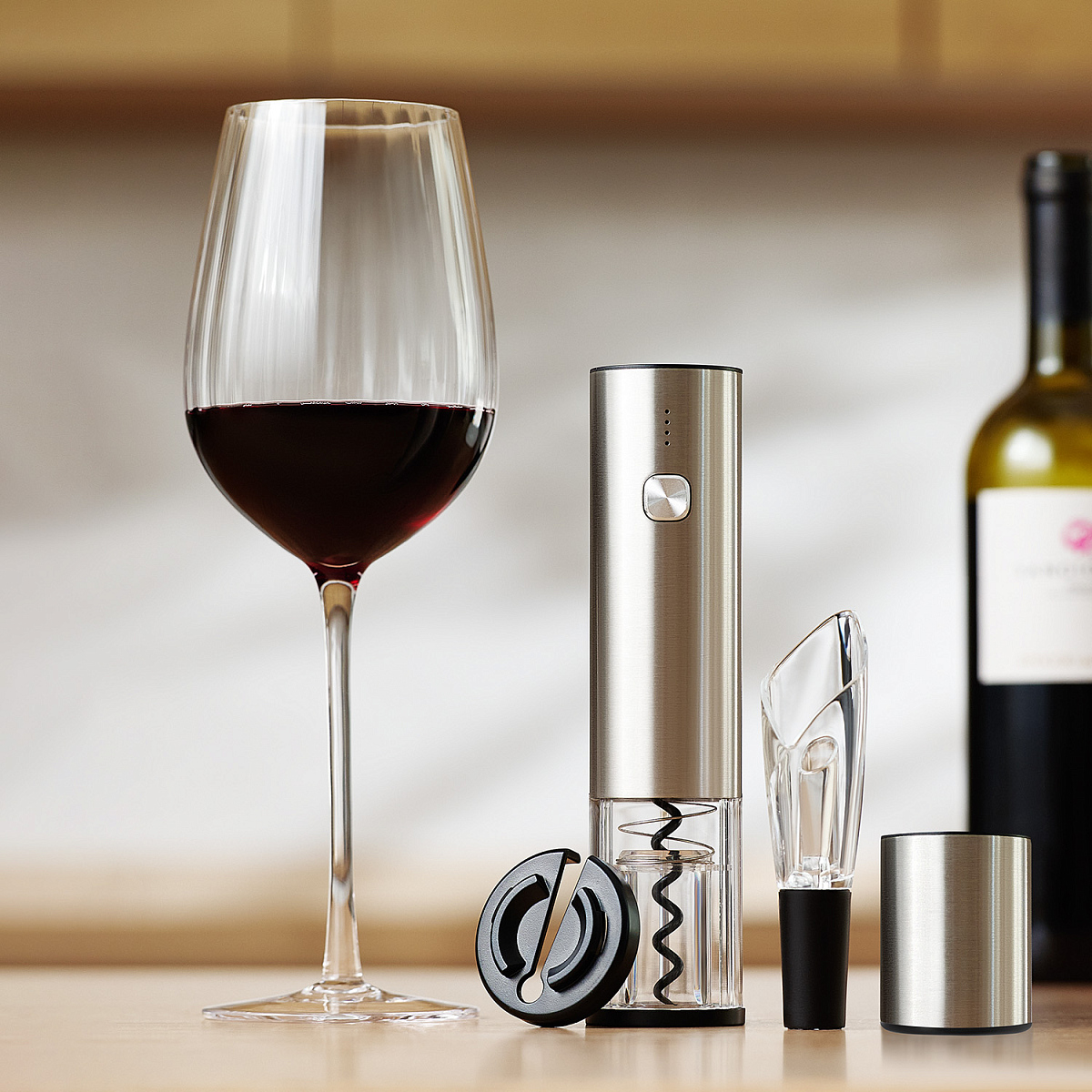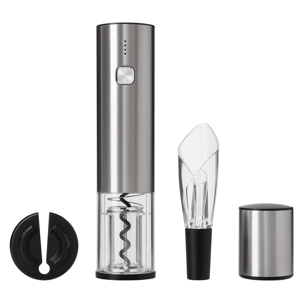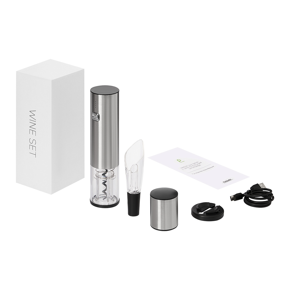 В стильной упаковке вы найдете все необходимое для идеального винного вечера: электрический штопор, вакуумную пробку, аэратор и нож для срезания фольги. Этот набор станет прекрасным корпоративным подарком или отличным дополнением к домашнему бару.