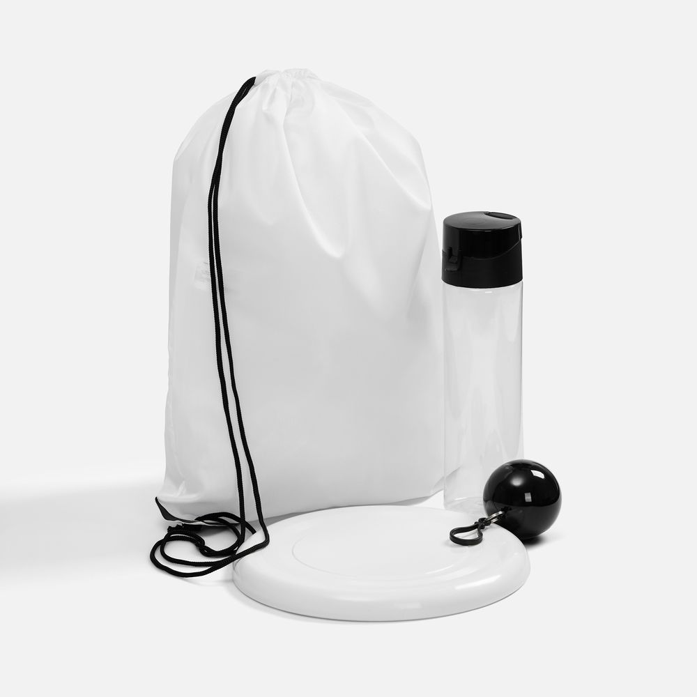 - Практичность — бутылка, тарелка-фрисби и дождевик в футляре решают базовые потребности на отдыхе.