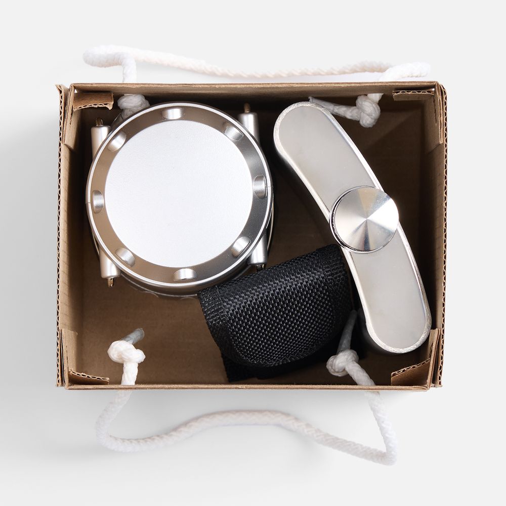 Практичный сет для похода в лаконичном и стильном исполнении: мультитул-плоскогубцы, кемпинговый фонарь с дальностью луча 20 метров и классическая фляжка.