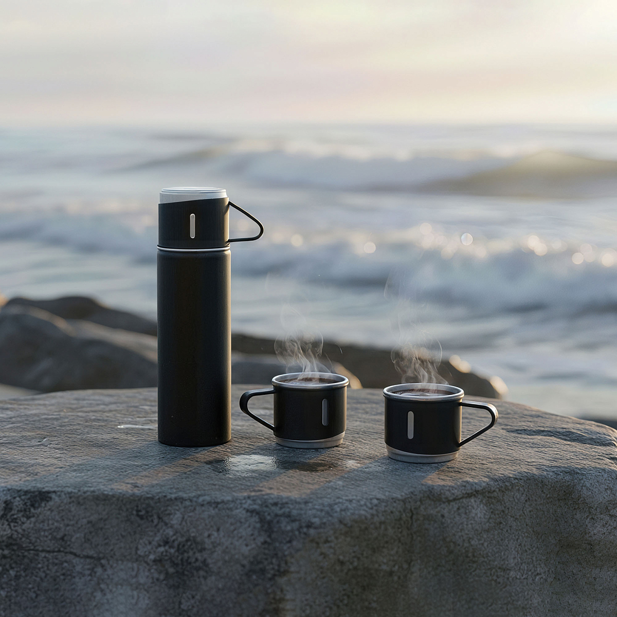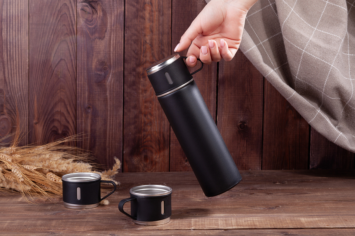 Термос удобно держать за ручку. Корпус в защитном порошковом покрытии (powder), рекомендуем гравировку газовым лазером и объемную уф-печать, см. фото. Колба из нержавеющей пищевой 304 стали. Клапан с кнопкой для удобного розлива и эффективного сохранения температуры напитка.