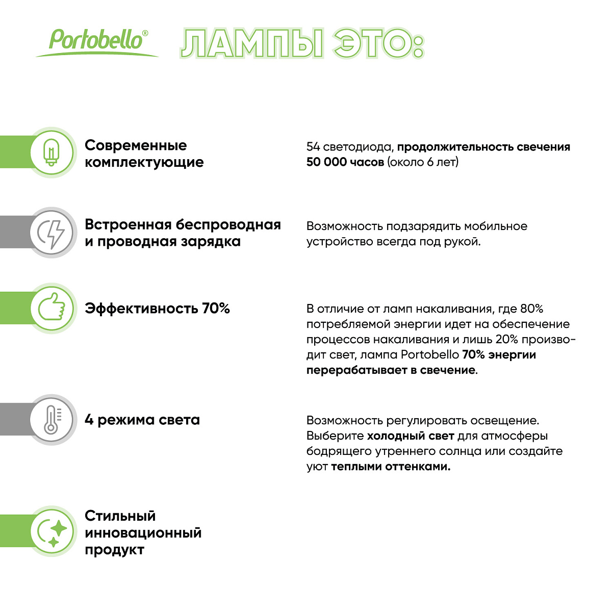 Входная мощность питания лампы 5V-2A предусмотрена для работы одной функции (освещение/беспроводная зарядка устройств/ зарядка устройств через USB выход)