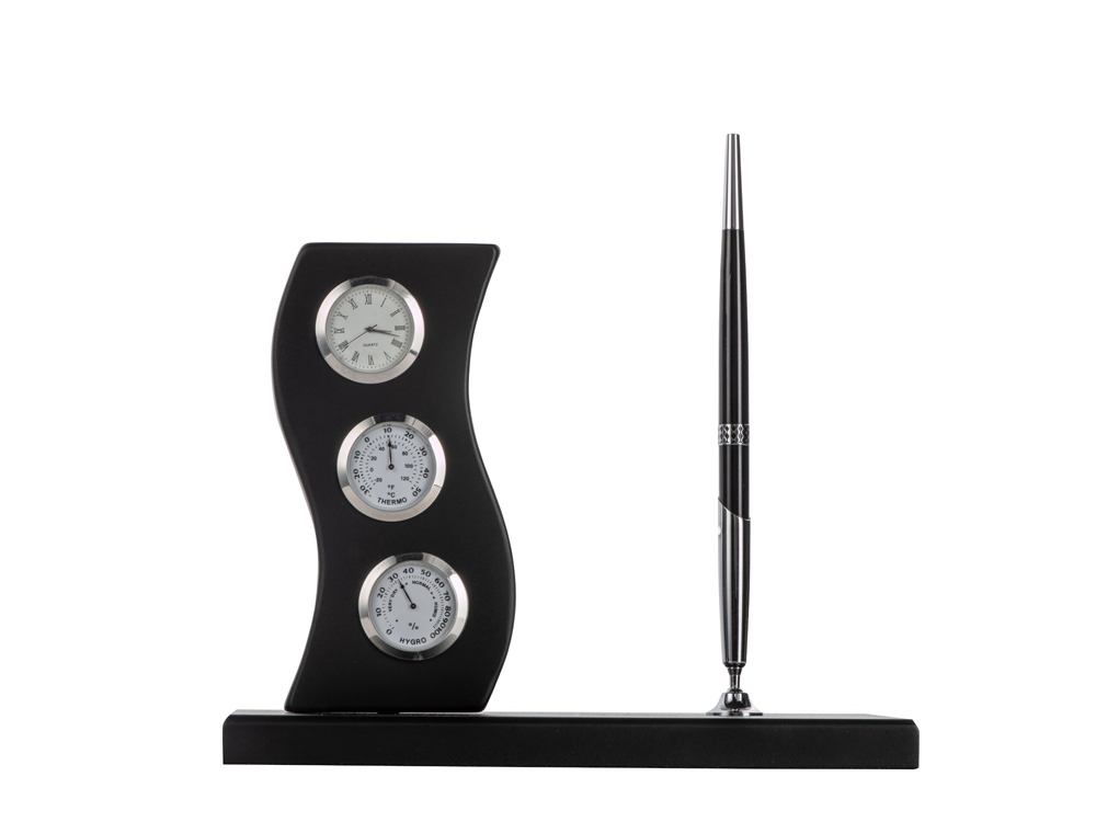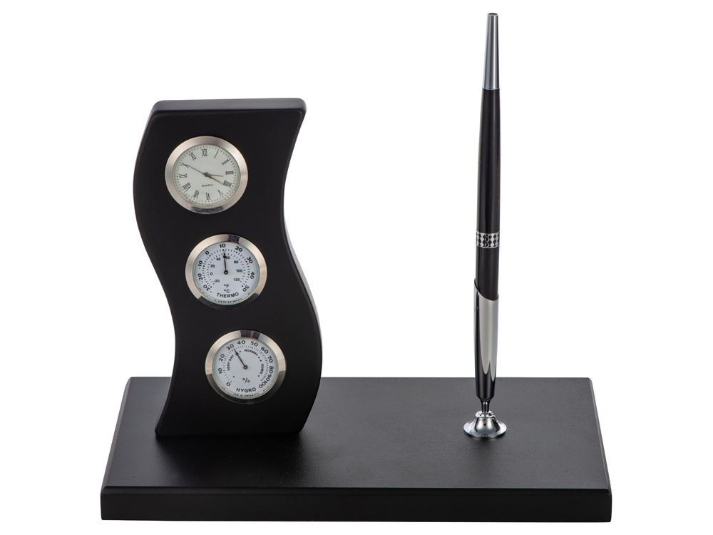 Замечательный прибор станет центральной фигурой рабочего стола руководителя. Настольный прибор оснащен держателем для ручки, шариковой ручкой, часами и небольшой метеостанцией. Удачное сочетание цветов и фактур не оставит равнодушным даже самых притязательных.