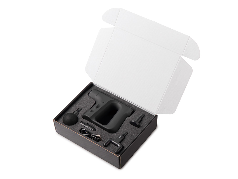 Массажёр оснащён четырьмя насадками и светодиодным индикатором мощности, что позволяет его использовать для разных групп мышц, подбирая необходимый тип массажа и его интенсивность.