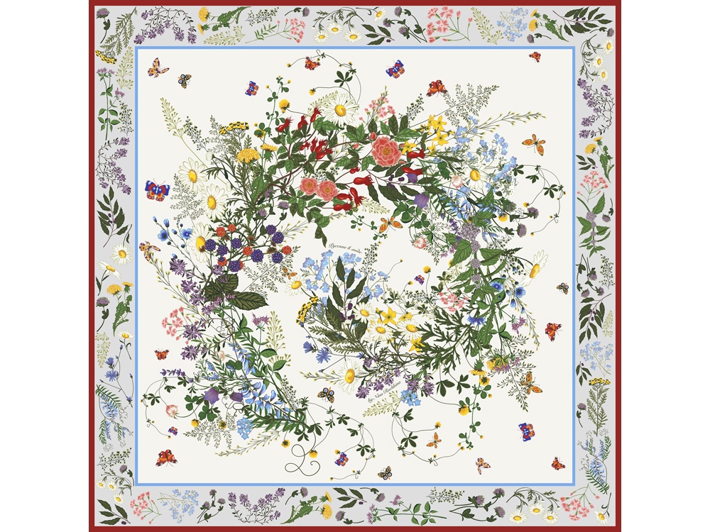 Яркое благоухающее разноцветье русского полевого букета воплощено в шелковом платке, где собраны изображения более 20 цветов и трав.