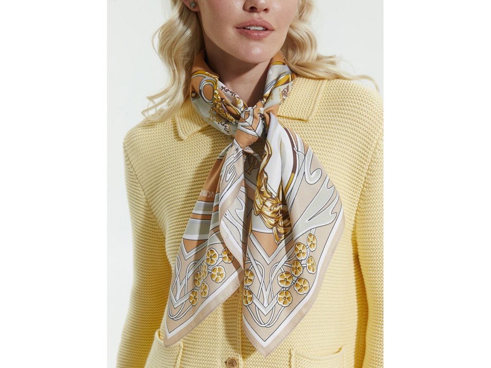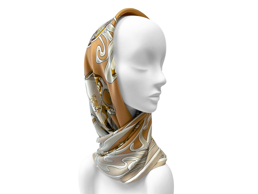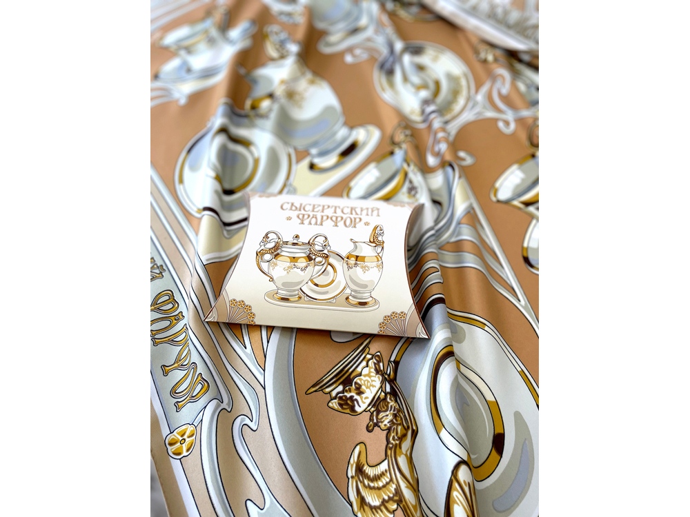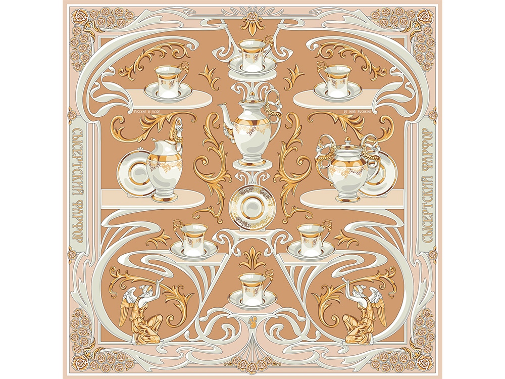 Платок Сысертский фарфор от дизайнера Нины Ручкиной посвящается уральскому народному промыслу, известному с 19 века. Композиция платка словно сказочный лабиринт увлекает за собой, вызывая желания рассматривать детали утонченного сервиза работы уральских мастеров. Изящные фарфоровые предметы расположены в ажурном серванте эпохи модерна. Сочетания благородного золота и слоновой кости, плавные линии и стилизованные цветы рождают необычайно элегантный дизайн авторского аксессуара. Такой платок привнесет дополнительный шик как в базовый гардероб, так и в вечерний стиль. Отголоски многоликого русского модерна, декоративность и символизм, история России и современный дизайн превращают этот платок в великолепный подарок со смыслом. Над дизайном работали: Нина Ручкина, Наталия Александрова.