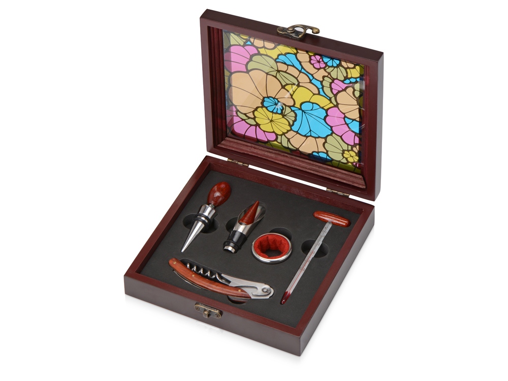 Подарочный набор аксессуаров для вина в эффектной винтажной шкатулке отличной подойдет для людей с тонким вкусом. В набор входят воротничок на бутылку, воронка-аэратор, пробка для бутылки, штопор-открывалка, термометр.