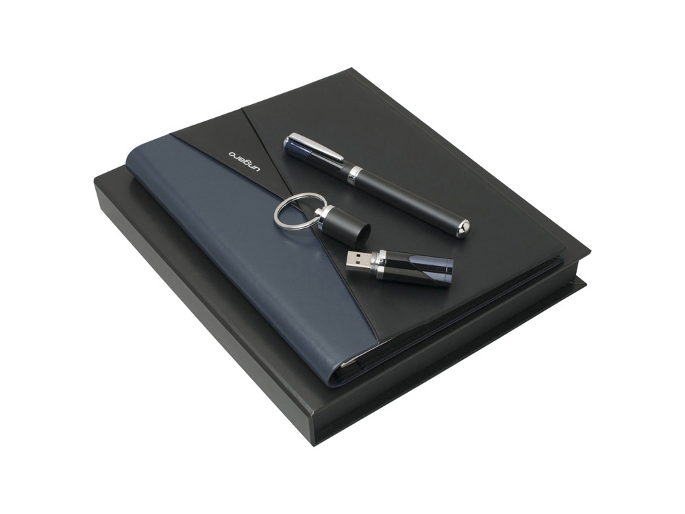 Комплектность: папка А5 с блокнотом 22 х 17,4 х 2 см, флешка d1,7 х 7,45 см, ручка роллер d1,2 х 13,7 см