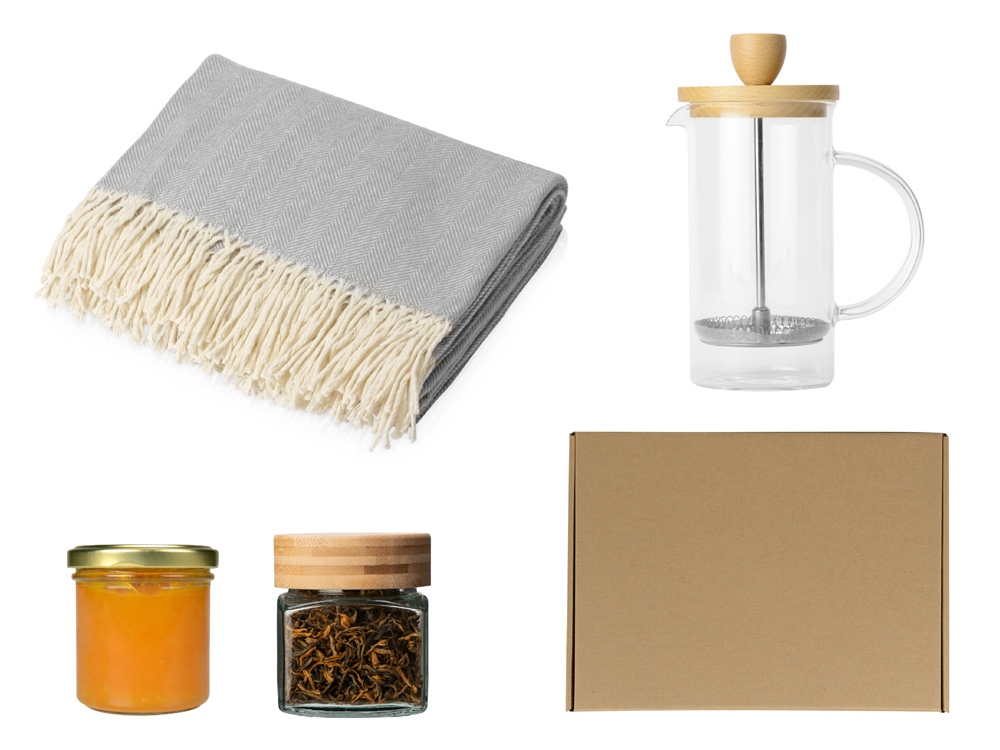 Подарочный набор с пледом, френчпрессом, чаем и вареньем можно заказать в нашей компании по самой доступной цене от 4 305.65 рублей.