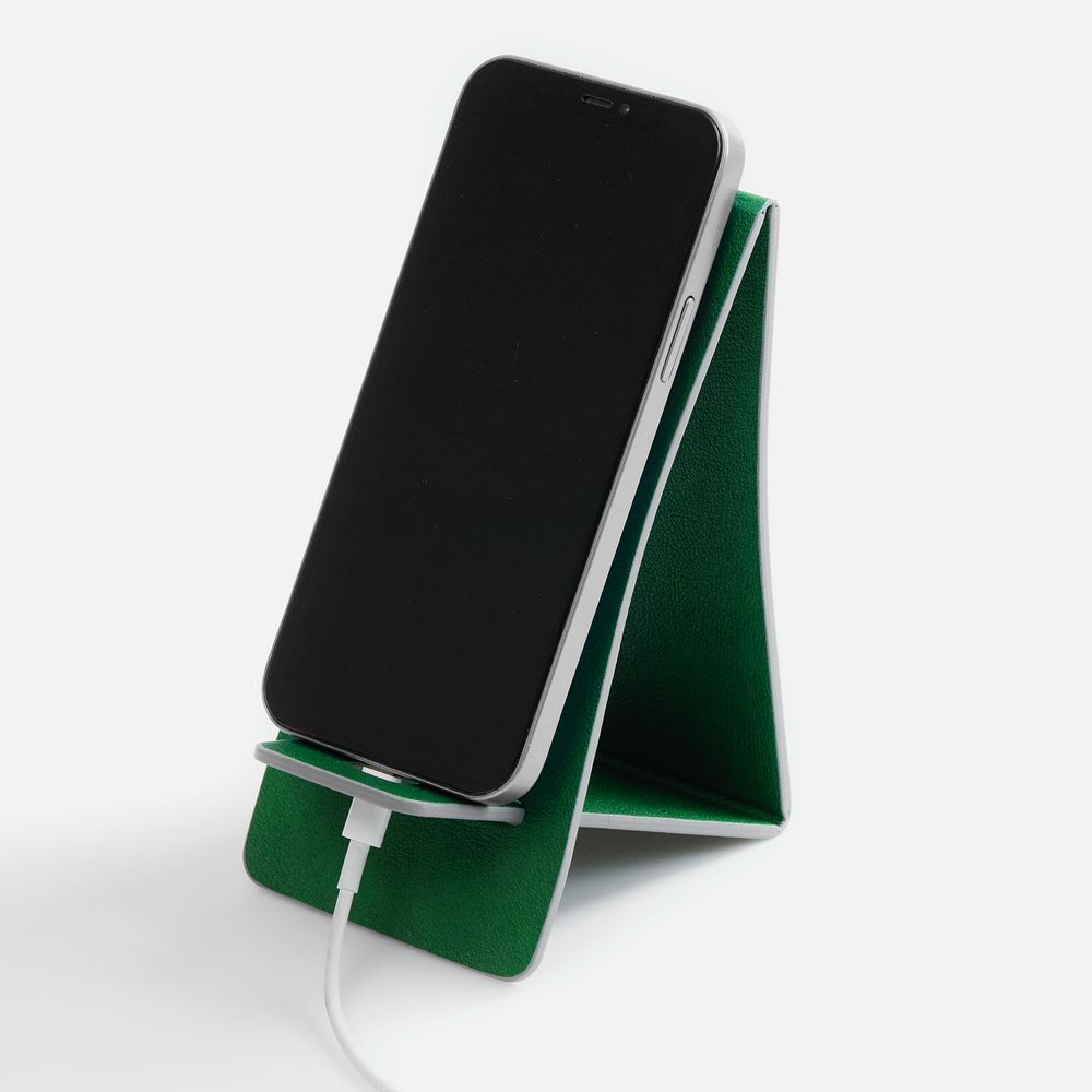 Складная подставка для телефона с вырубкой под шнур зарядного устройства. Выполнена из материала Petrus.