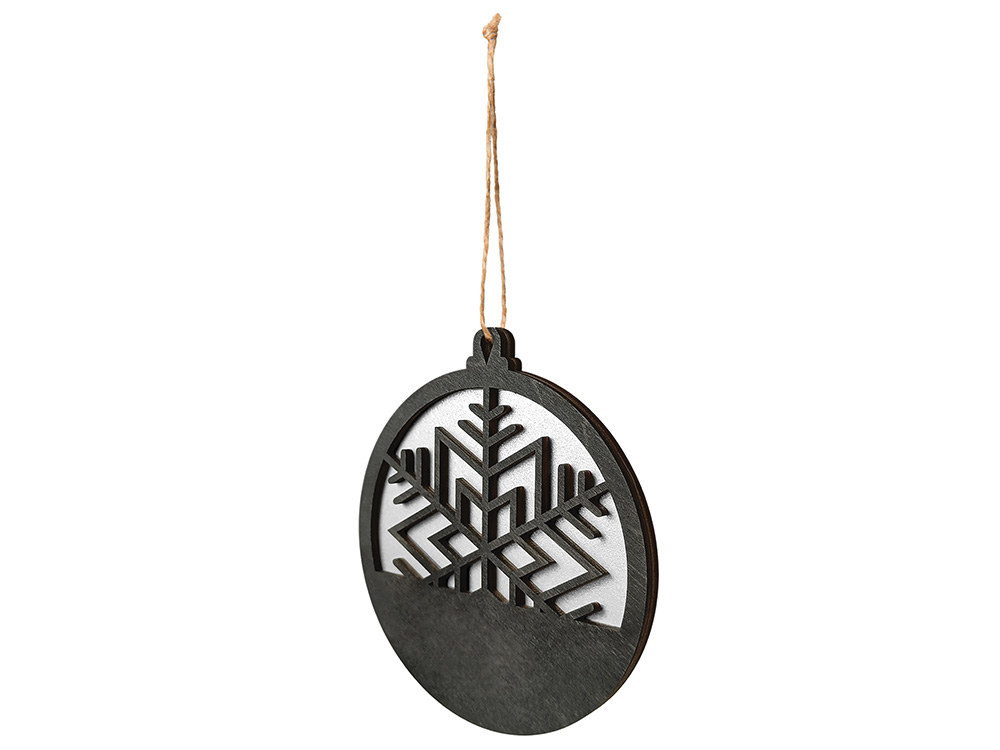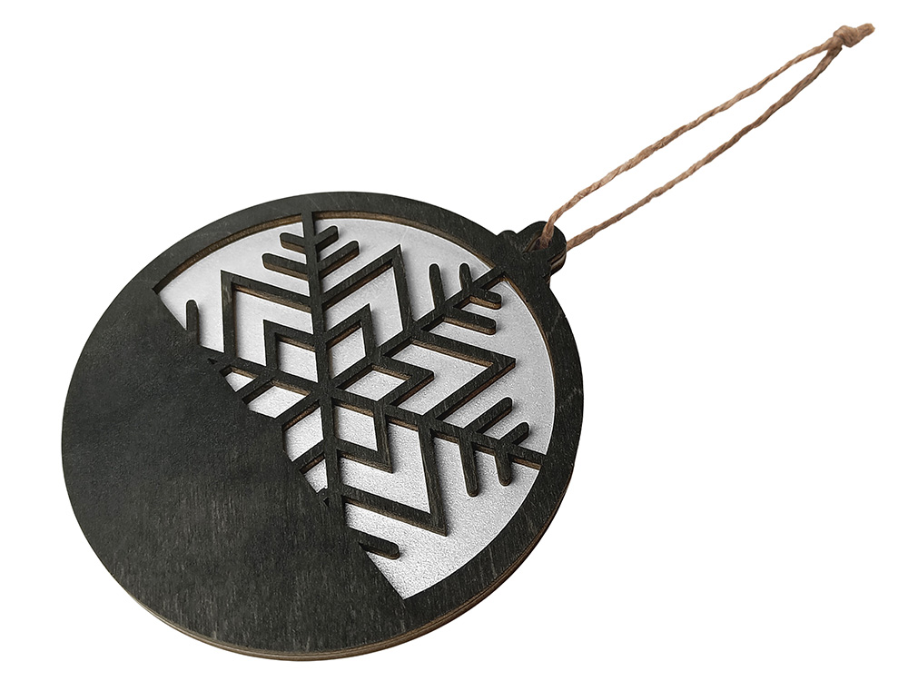 Стильная и минималистичная подвеска в форме снежинки выполнена из натуральной березовой фанеры. Сочетание черного и серебристого оттенков создаёт ощущение зимнего холода и утончённой простоты.