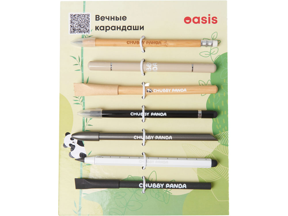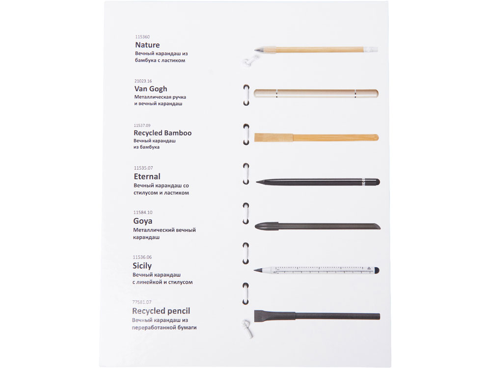 Промо-сет вечных карандашей — это презентационный комплект, включающий 7 уникальных моделей с несколькими вариантами нанесения: УФ-печать, тампопечать, гравировка. В сете представлены самые хитовые позиции категории вечных карандашей, а также новинки каталога периода зима-весна 2026 года. Все образцы аккуратно закреплены на стильной картонной подложке при помощи резинового фиксатора. На обратной стороне указаны названия и краткое описание моделей. Промо-набор — идеальный инструмент для презентаций: клиенты могут подержать карандаши в руках, опробовать их на письме и наглядно увидеть различия между видами нанесения. При этом все самые важные модели собраны в одном легком и компактном наборе.