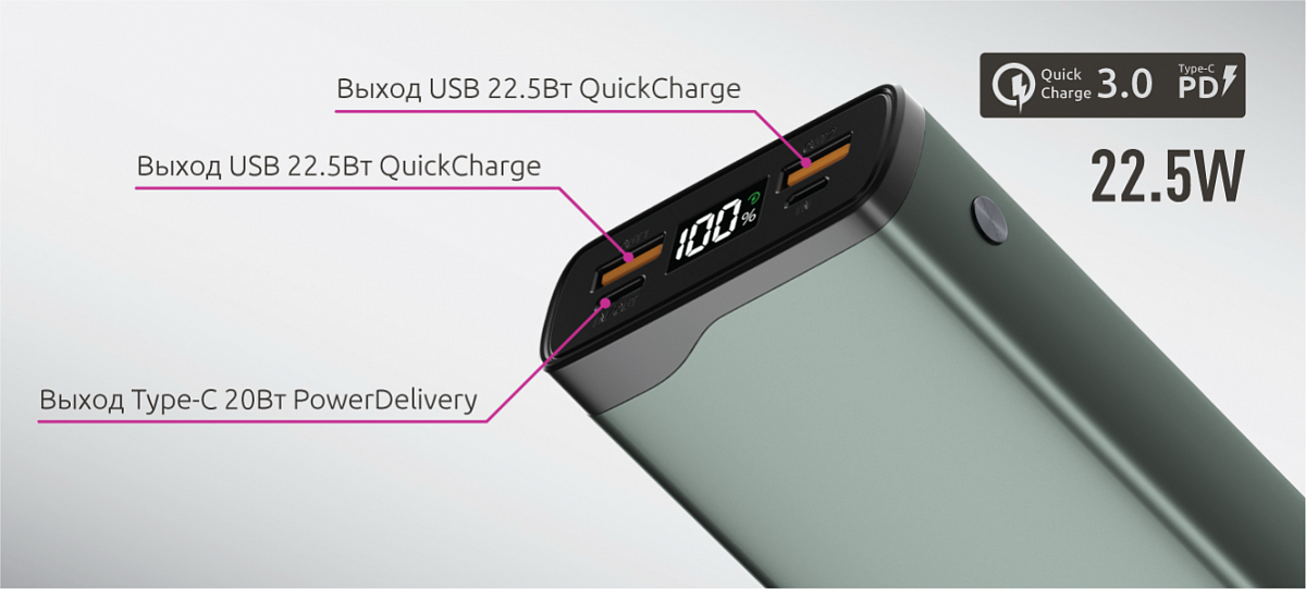 Выходы: 2хUSB 22,5 Вт QuickCharge 3.0 и Huawei SuperCharge, Type-C PowerDelivery 20 Вт