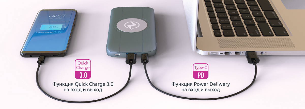 Выходы: Type-C 5-6.5 В/3 А, 6.5-9 В/2 А, 9-12 В/1,5 А (Power Delivery); USB 5-6.5 В/3 А, 6.5-9 В/2 А, 9-12 В/1,5 А (Quick Charge 3.0), QI 10 Вт Макс (9 В /1,1 А, 5 В/1 А)