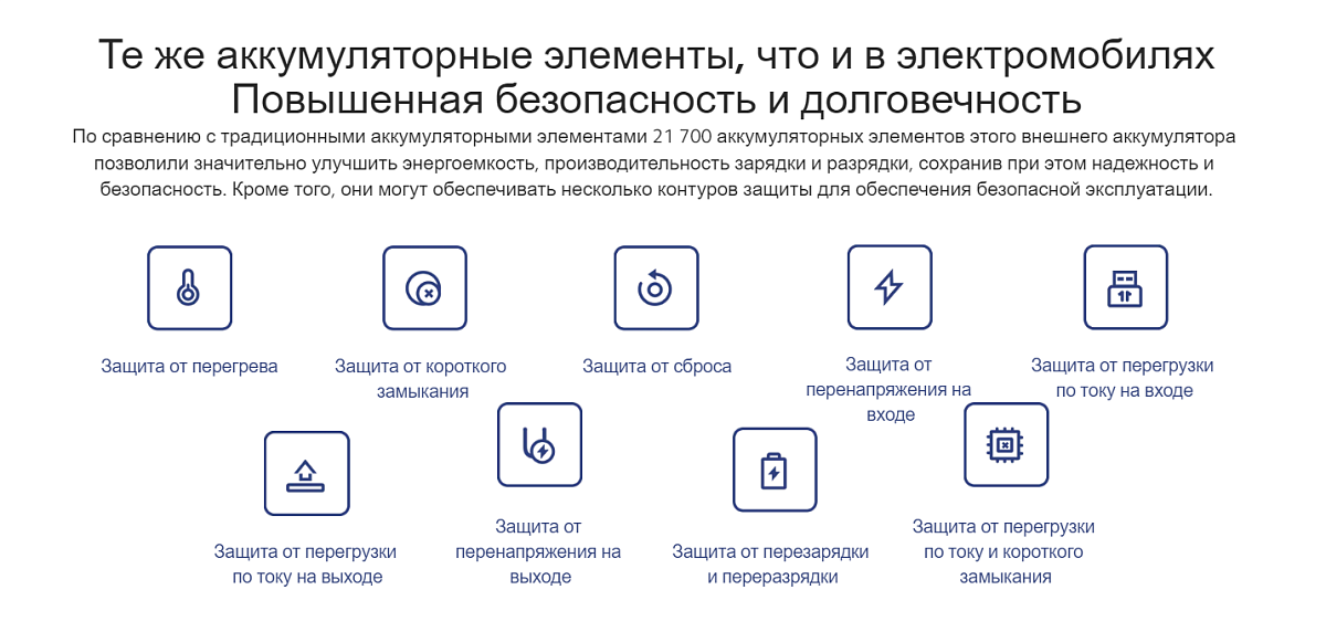 Особенности: новый тип аккумуляторов большей ёмкости формата 21 700; защита от перегрузки по току и короткого замыкания; экологичный корпус из PC + ABS; инновационный внешний дизайн; скрытый индикатор зарядки; кабель USB-A/USB-C в комплекте