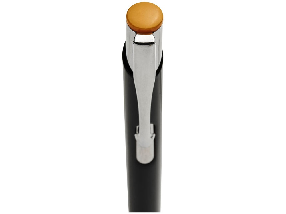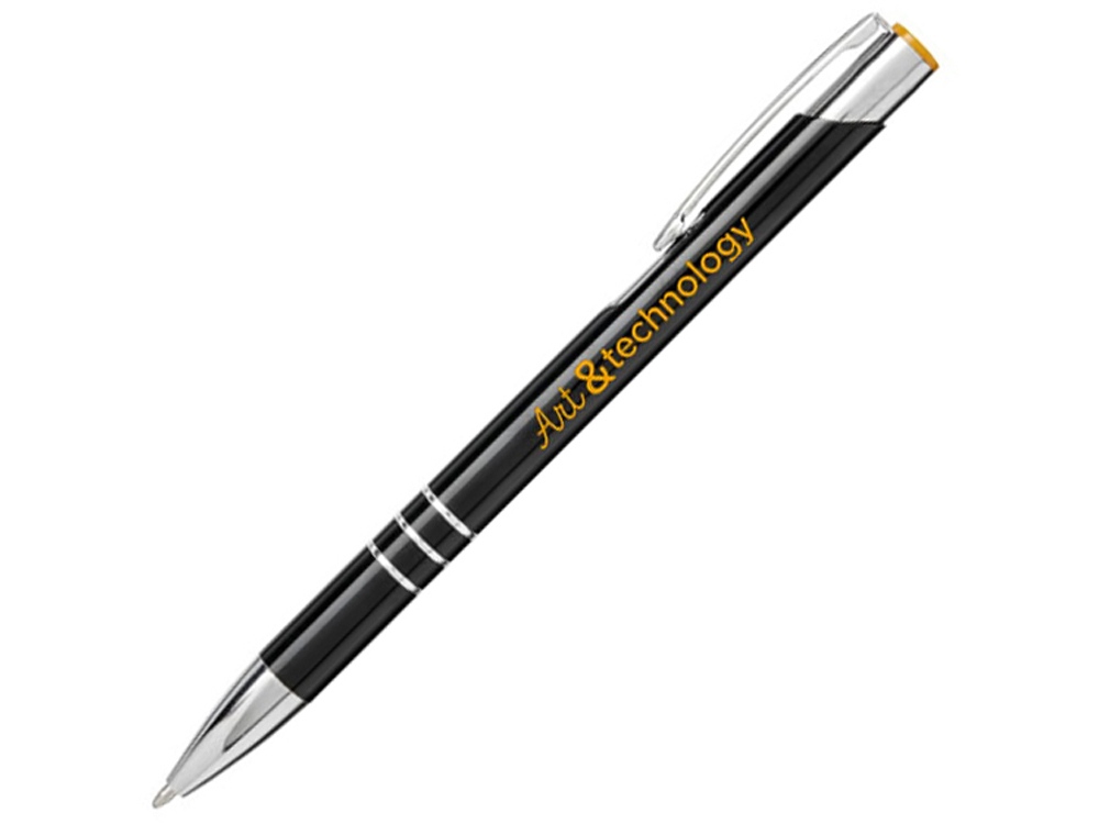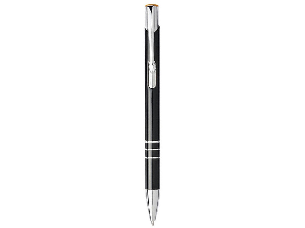 Черная шариковая ручка с кнопочным механизмом. Цвет кнопки совпадает с цветом гравировки.