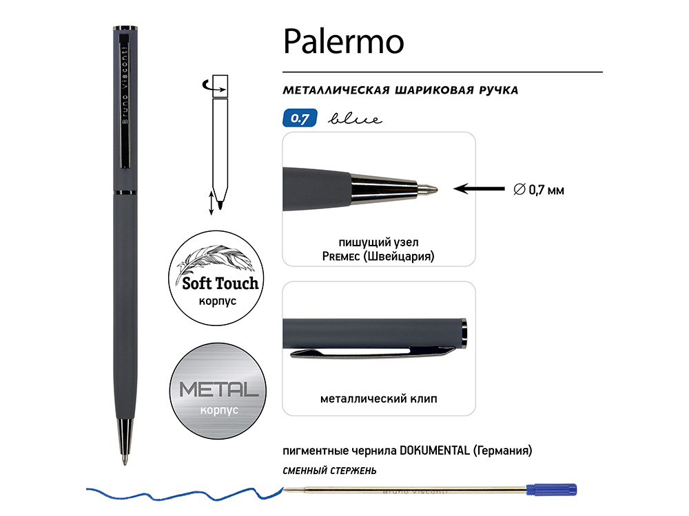 Автоматическая металлическая ручка Bruno Visconti серии Palermo однотонного цвета порадует любителей всего изящного и утонченного. Покрытие корпуса Soft Touch гарантирует дополнительный комфорт в работе с ней. Стержень легко выдвигается благодаря поворотному механизму. Синие пигментные чернила Dokumental (Германия) и пишущий узел Premec (Швейцария) обеспечивают качественное и мягкое письмо.